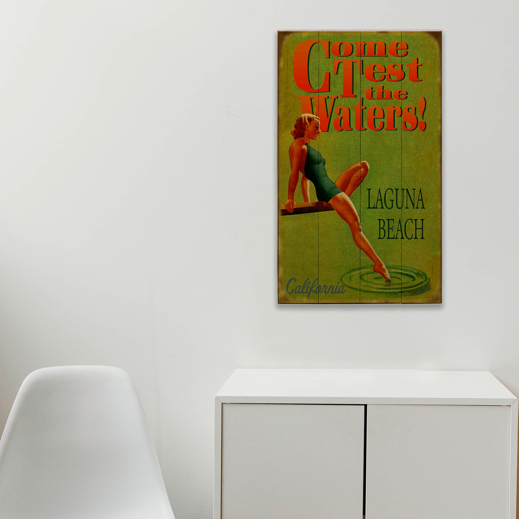 Step into the golden age of California beach culture with "Test the Waters" This vibrant artwork celebrates the timeless allure of the California beach, featuring a stylishly poised swimmer on a diving board, ready to plunge into the inviting waters below. The rich colors and dynamic composition capture the spirit of leisure and sun-soaked adventures. Perfect for lovers of retro art and coastal decor invites viewers to dive into the beauty of Laguna Beach's oceanic charms.