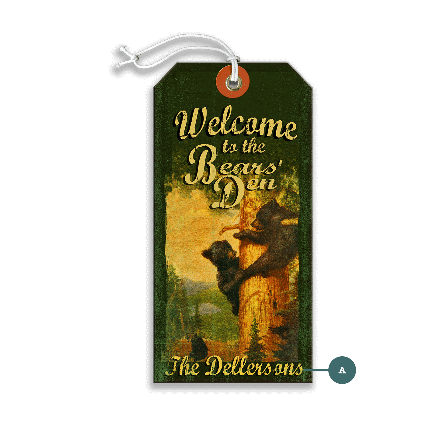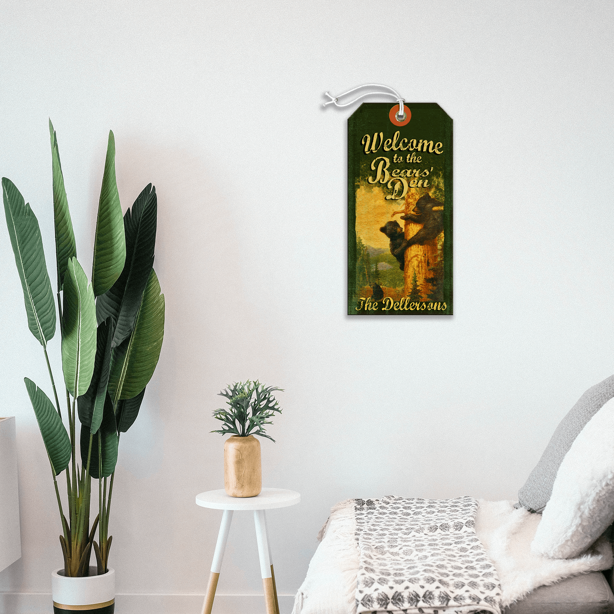 This charming woodland-themed wall art is perfect for creating a cozy and inviting atmosphere in any home or cabin. Featuring playful young bears climbing a tree against a scenic forest backdrop, the piece warmly welcomes guests to "The Bears' Den." The vintage-inspired design, combined with a rustic background, adds a touch of nature and nostalgia to your decor. Ideal for entryways, living rooms, or any space where you want to evoke the tranquility of the great outdoors.