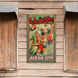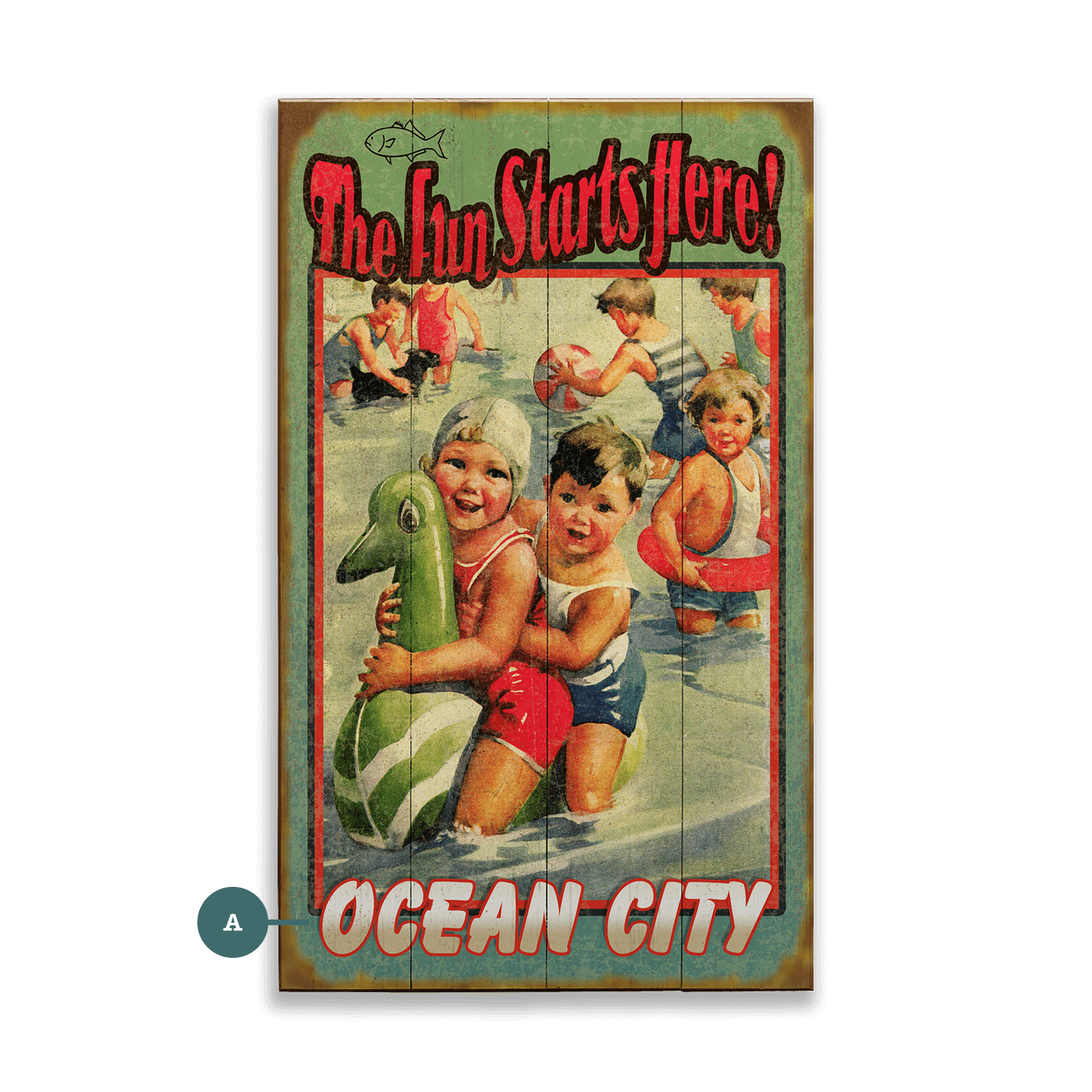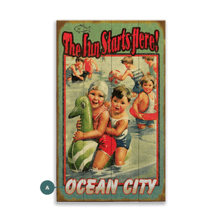 Overflowing with sunshine and smiles, this cheerful artwork captures the magic of a classic beach day in full swing. Young children splash and play in the shallow waves, clinging to floaties and beach balls, their faces lit up with joy and energy. The bright colors and vintage charm transport you to a time of summer fun, water games, laughter, and carefree days in the sun. Perfect for family beach houses, kids’ spaces, or coastal decor, this piece is a heartwarming reminder that the fun really does start here—where the water’s cool, the sand is warm, and every moment feels like a memory in the making.