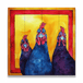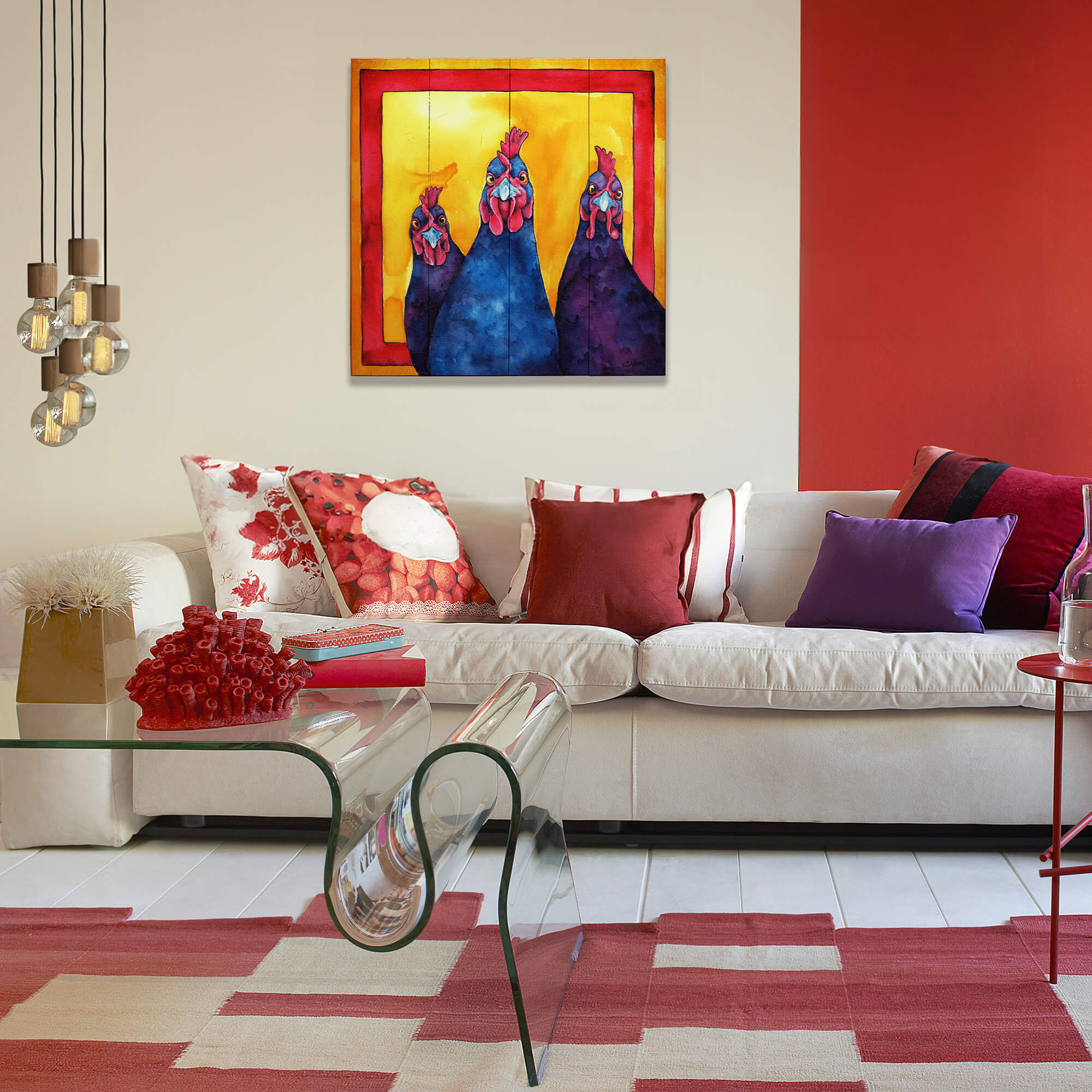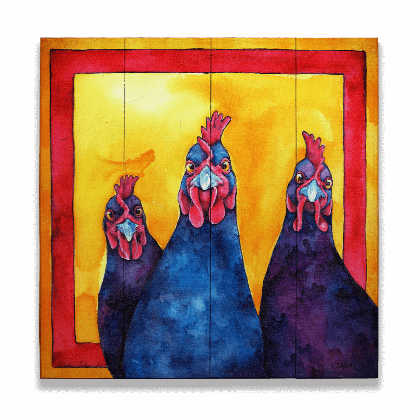 This vibrant and expressive artwork features three hens set against a brilliant yellow background, capturing their unique personalities and quirky charm. The rich, deep blues and purples of the hens contrast beautifully with the vivid backdrop, highlighting their detailed features and comical expressions. This piece is perfect for adding a playful and colorful touch to any room, particularly kitchens or dining areas. It celebrates the often overlooked beauty and character of farm animals, making it a delightful addition for both art collectors and those who appreciate a touch of humor and whimsy in their decor.
