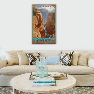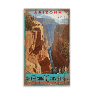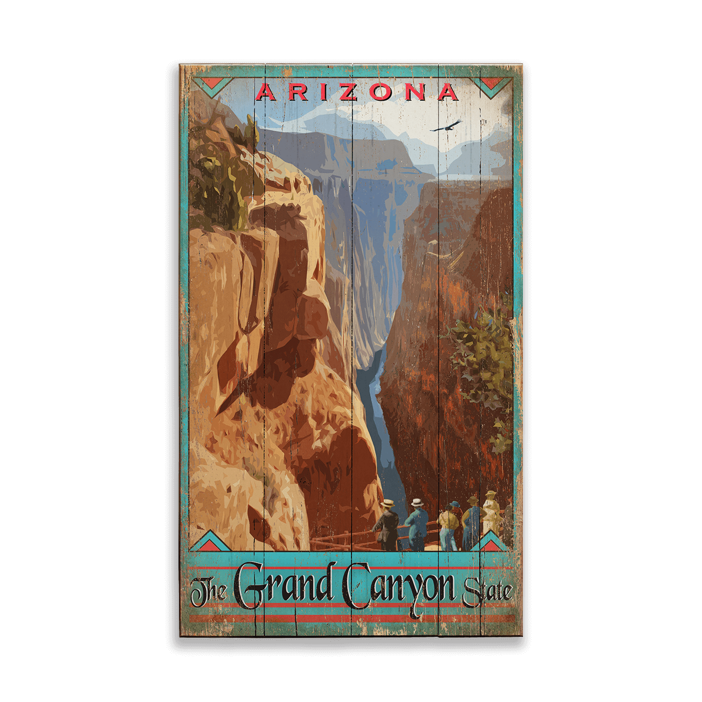 Explore the majestic beauty of Arizona with this stunning vintage-style poster, "The Grand Canyon State." This artwork captures the breathtaking vistas of the Grand Canyon, featuring hikers gazing out over its vast, layered rock formations and deep gorges. Perfect for nature lovers and adventurers alike, this piece brings the awe-inspiring scenery of one of the world’s natural wonders into your home or office.