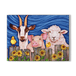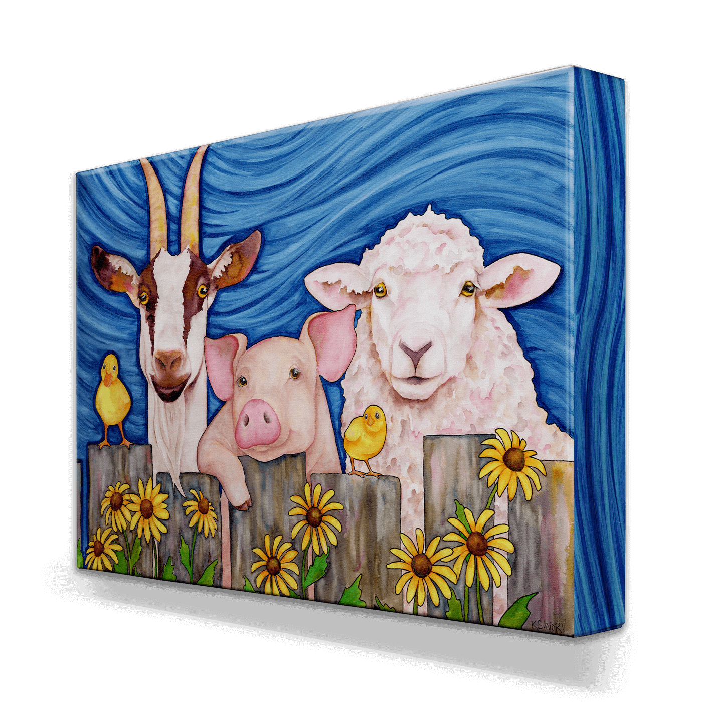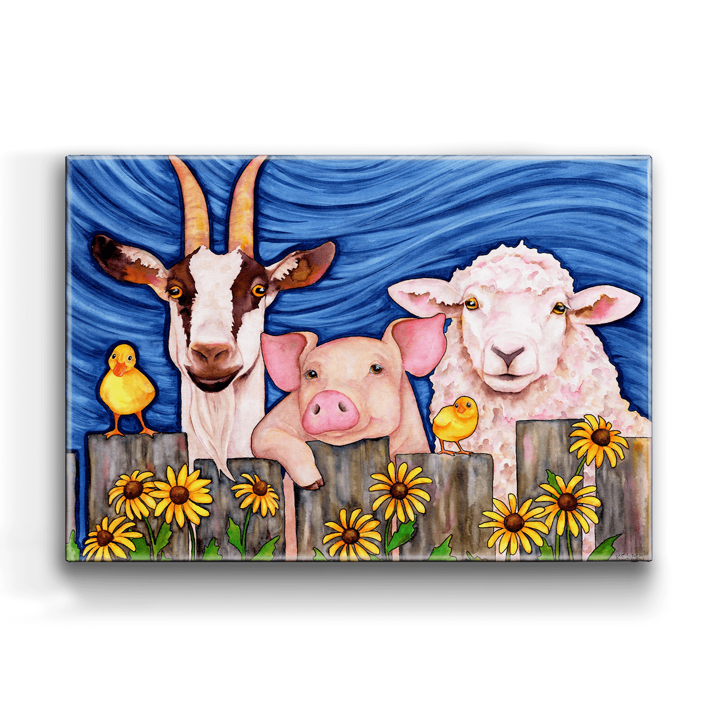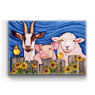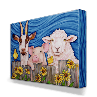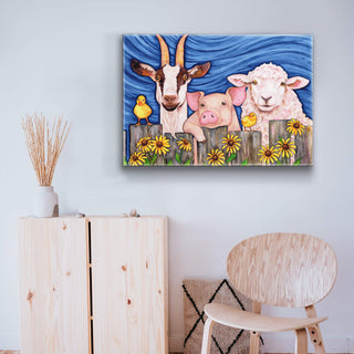 Bring a touch of farmyard joy to your decor with this charming artwork featuring a friendly goat, pig, and sheep, accompanied by two adorable yellow chicks. Set against a vibrant blue backdrop with cheerful sunflowers, each animal’s expression radiates warmth and personality, making this piece a delightful addition to any room. Perfect for animal lovers and those who appreciate whimsical, country-inspired art, this piece adds a playful and heartwarming vibe to your space.
