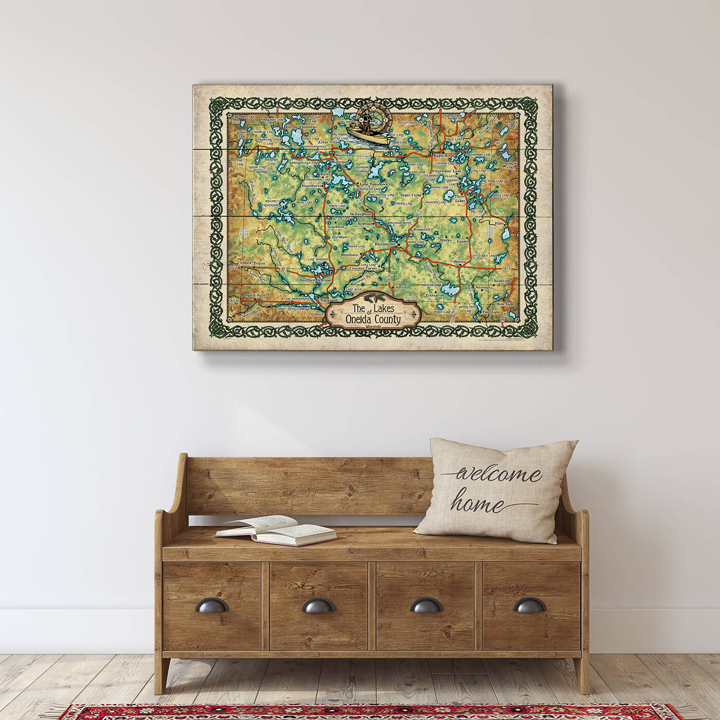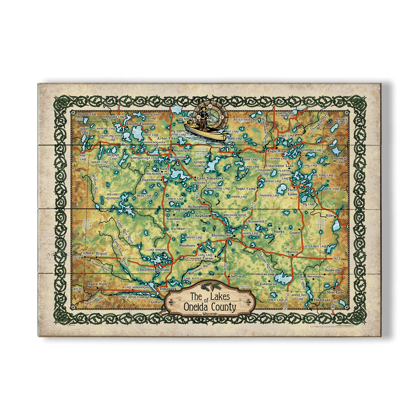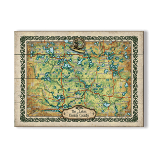 This beautifully crafted map showcases the lakes of Oneida County in exquisite detail, blending art with functionality. The map features a rich palette of colors and decorative borders, enhancing its visual appeal and making it a perfect centerpiece for any room. Each lake is clearly marked, along with key landmarks and topography, making it an ideal reference for locals and visitors alike. Whether you're a history buff, a nature enthusiast, or someone who appreciates fine artwork, this map of Oneida County's lakes is a must-have.