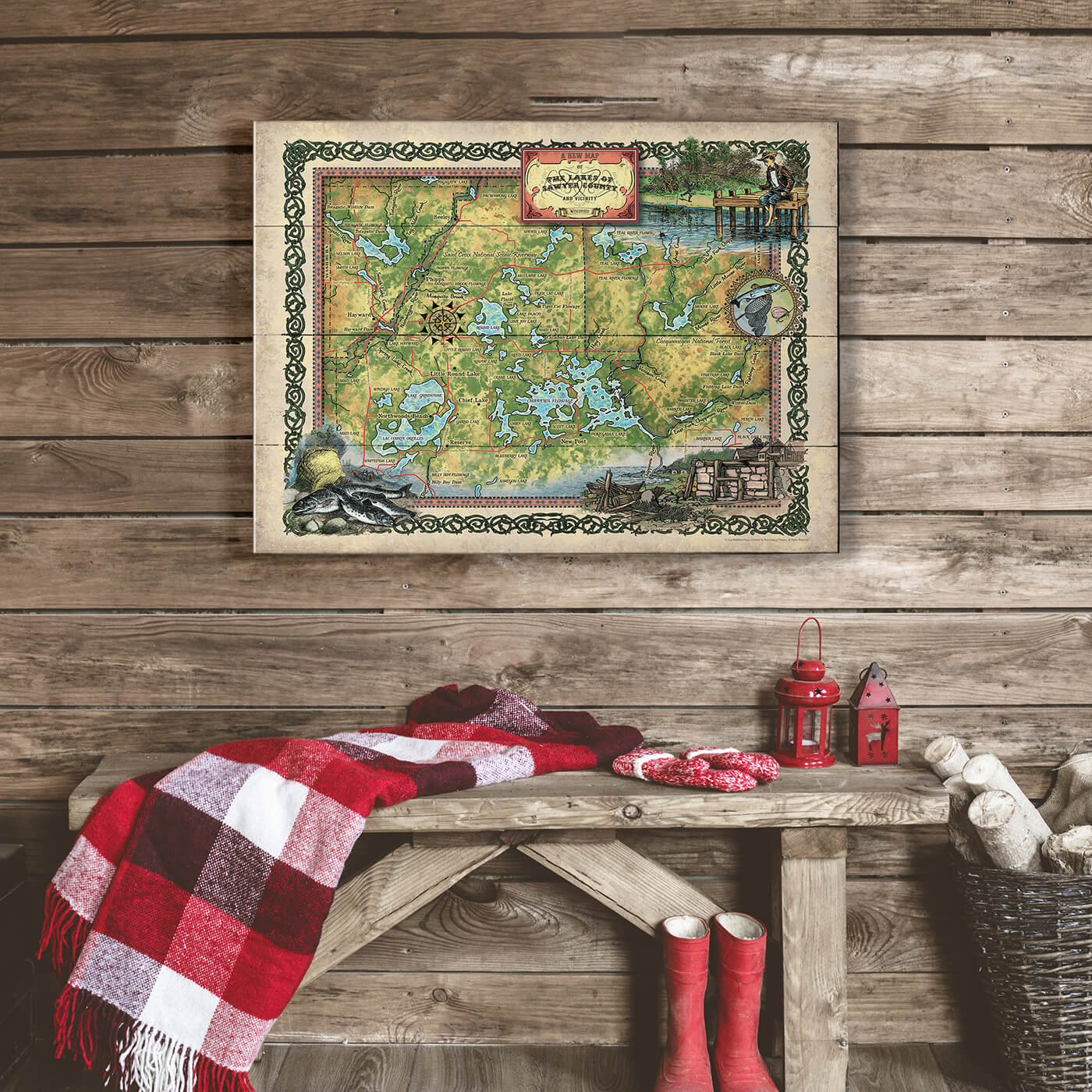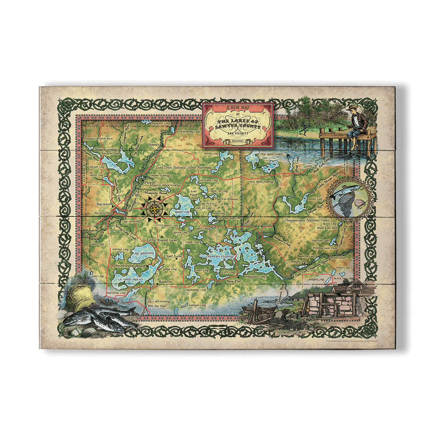 Immerse yourself in the natural beauty of Sawyer County, Wisconsin, with this meticulously crafted map highlighting these enchanting lakes. The artwork, adorned with a detailed and artistic border, vividly brings to life the rich tapestry of water bodies that define the region. Each lake is beautifully rendered, showcasing their unique shapes and connectivity, making this map both a practical guide for explorers and a splendid piece of art for any collector or enthusiast.