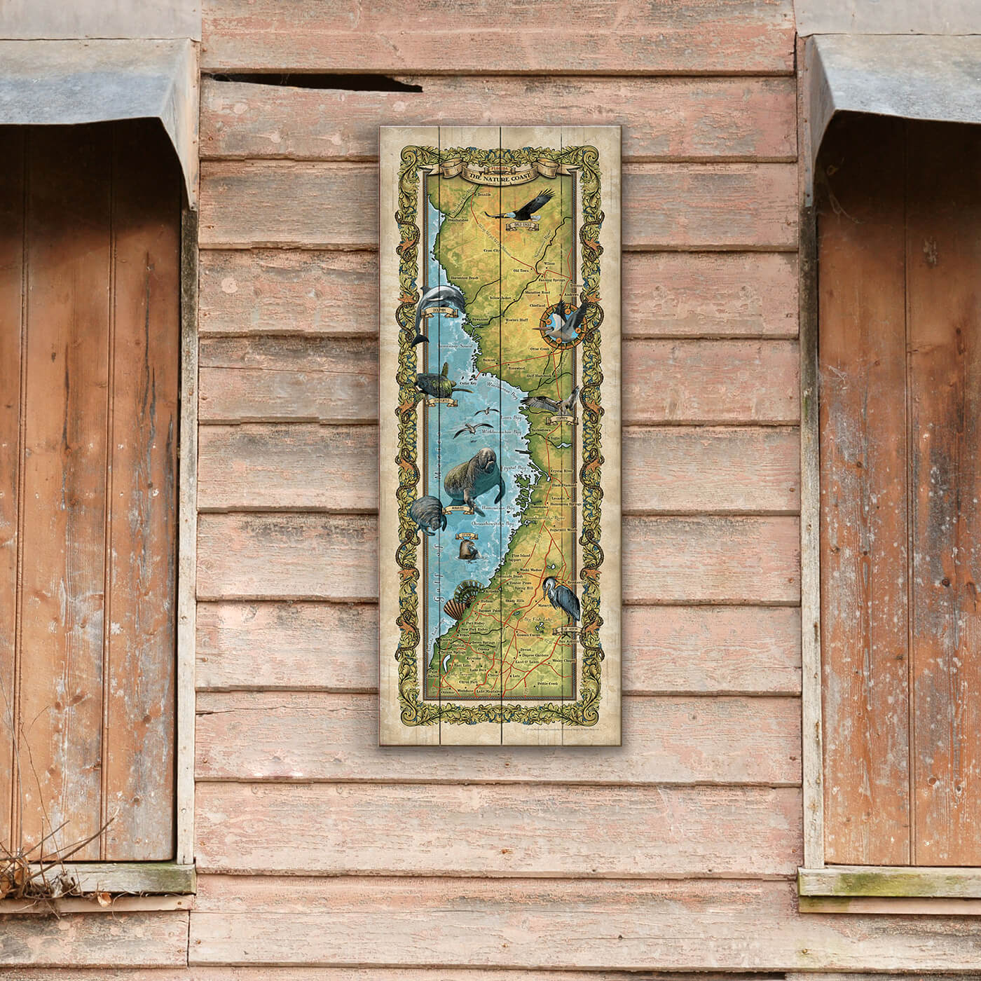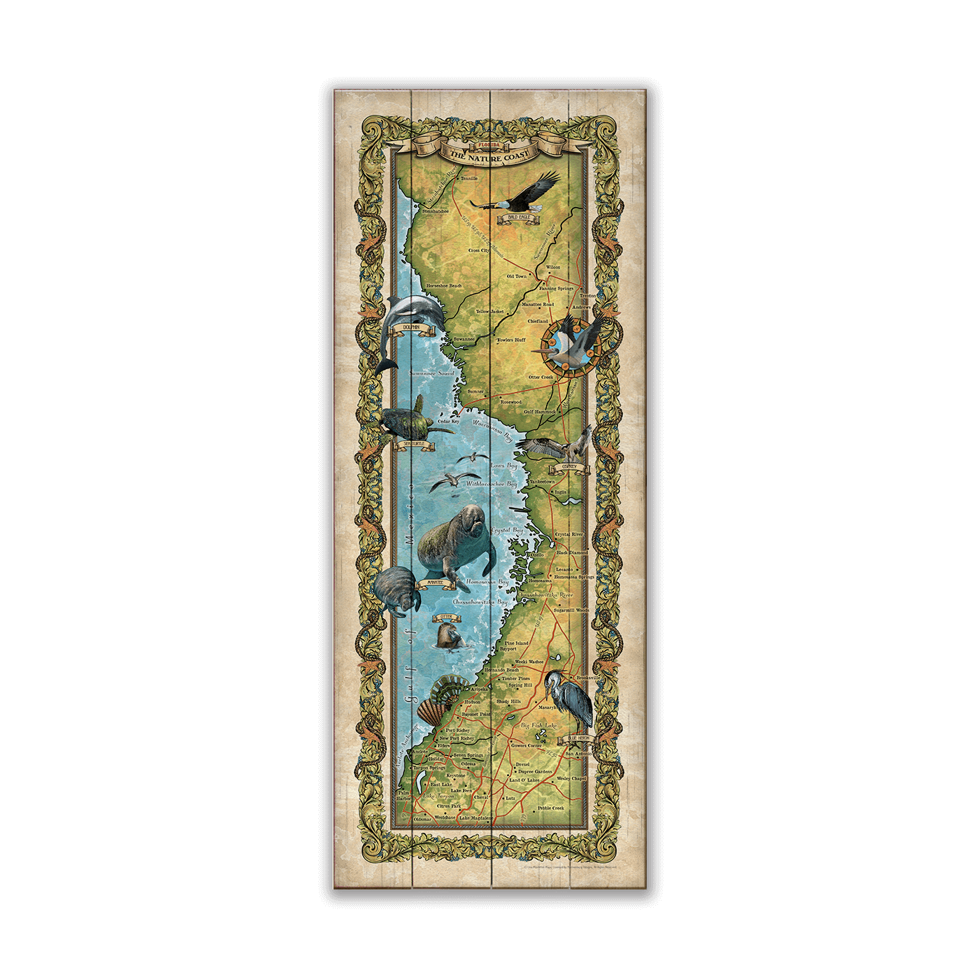 The illustration showcases the abundant wildlife that call this area home. Bursting with color and life, this map invites you to explore the pristine beauty and diverse ecosystems that define this coastal region. Whether you're a nature lover, an outdoor enthusiast, or a curious traveler, this map will inspire you to explore and connect with the extraordinary beauty of Florida's Nature Coast, a haven where nature reigns supreme.