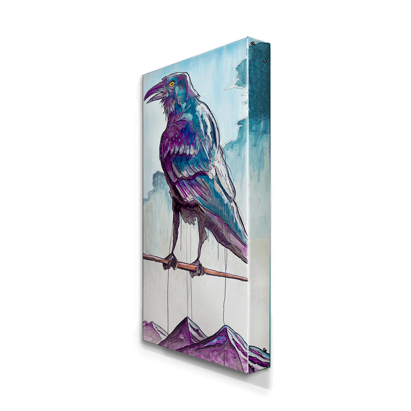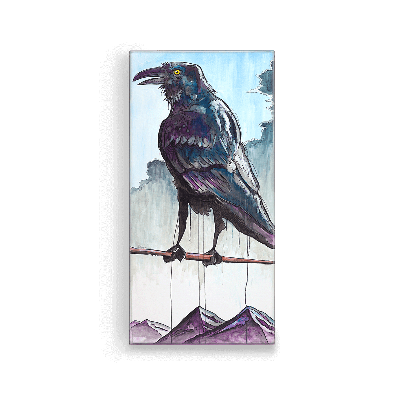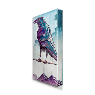 This artwork presents a striking raven perched on a branch, its sleek black feathers glistening with hints of blue and purple. Against a light sky, the raven's piercing gaze and sharp beak stand out, highlighting its keen intelligence and enigmatic aura. The background features soft, muted colors, allowing the raven's form to dominate the composition. The painting captures the bird's mysterious nature, embodying the spirit of the wild.