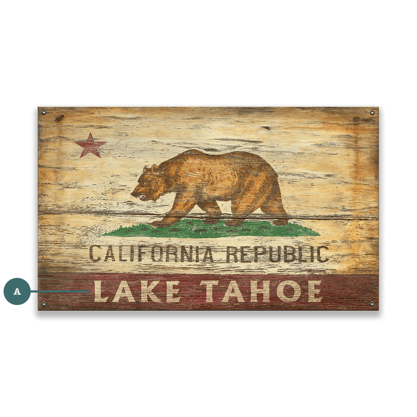 Celebrate the timeless look of the California Republic flag with this rustic, weathered-style wall art. Featuring the iconic grizzly bear, lone star, and classic vintage tones, the design recreates the feel of an aged sign that has welcomed travelers for generations. The bottom text can be customized, making it easy to highlight your favorite California destination, hometown, or adventure spot. Perfect for cabins, lake houses, and anyone who loves Western heritage or California pride, this piece adds warmth and character to any space.