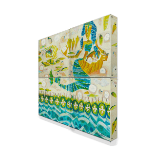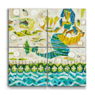 "The Shell Collector" is a captivating four-panel artwork that combines vibrant colors and intricate patterns to depict a serene beach scene. The artwork features a mermaid gracefully collecting shells, surrounded by an array of oceanic motifs. Each panel contributes to the overall composition, creating a cohesive and visually engaging piece. The rich blues, greens, and yellows bring a sense of calm and wonder, making it a perfect addition to any coastal or nature-inspired decor. "The Shell Collector" will add a touch of whimsy and charm to your space.