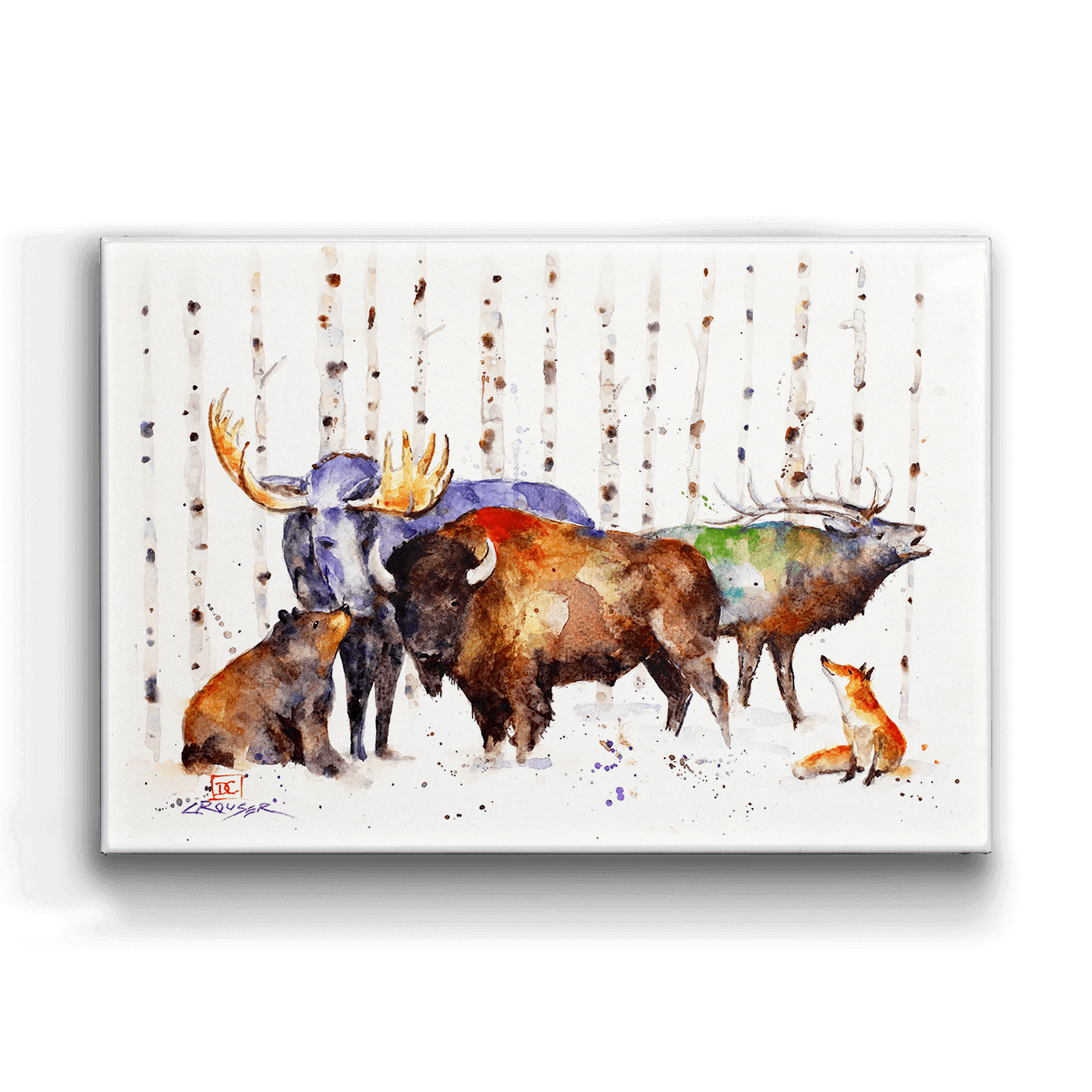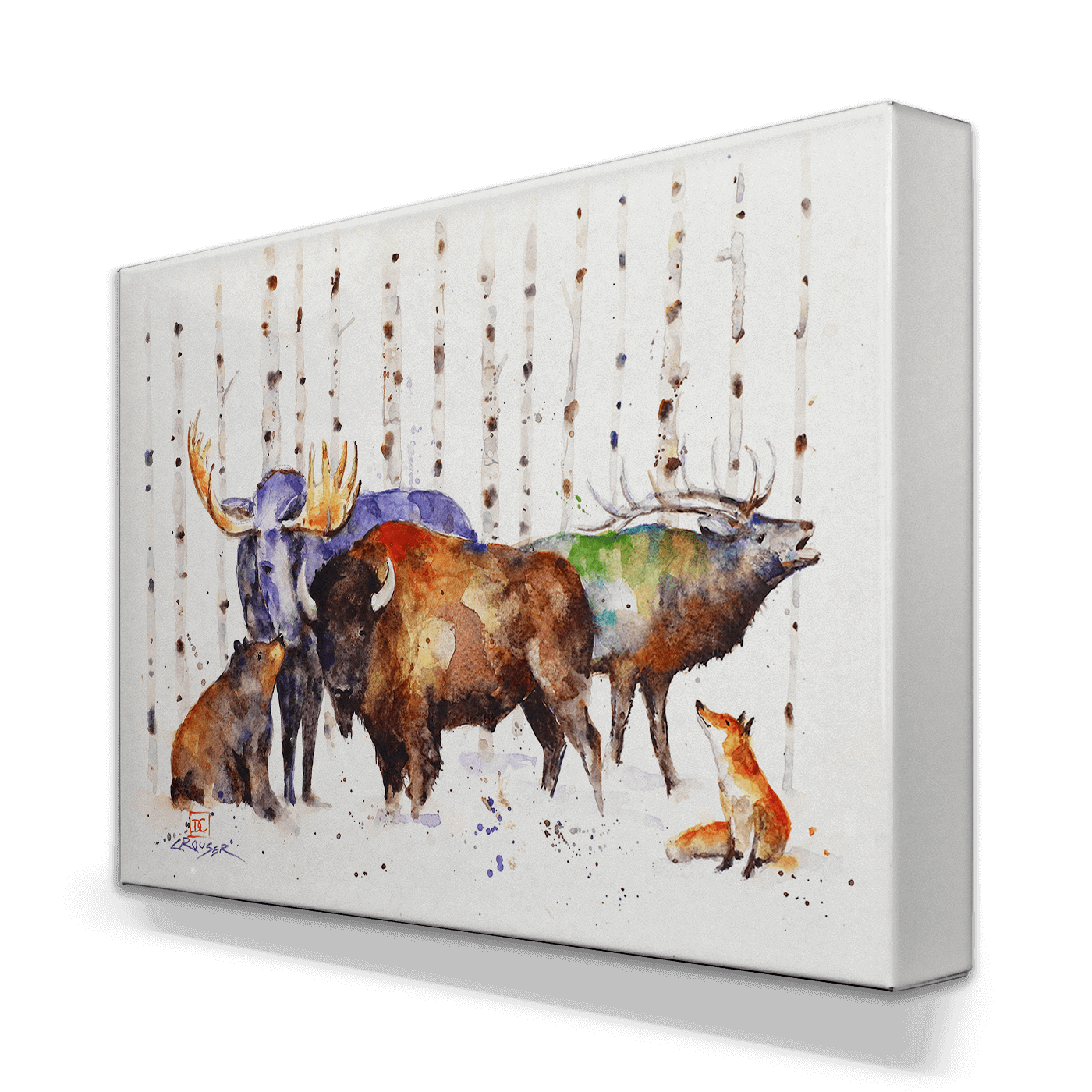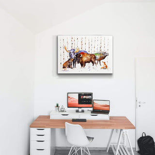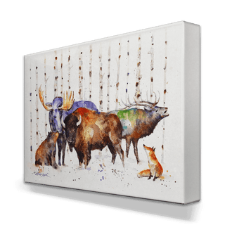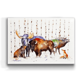This watercolor painting elegantly depicts a scene of wildlife with a majestic, moose, elk, and bison standing tall amidst a birch forest, accompanied by a curious bear and fox. The blend of natural tones with splashes of color captures the essence of the forest's inhabitants in harmonious coexistence. It's a perfect piece for those looking to bring the spirit of the wild and the serenity of the woods into their living space.