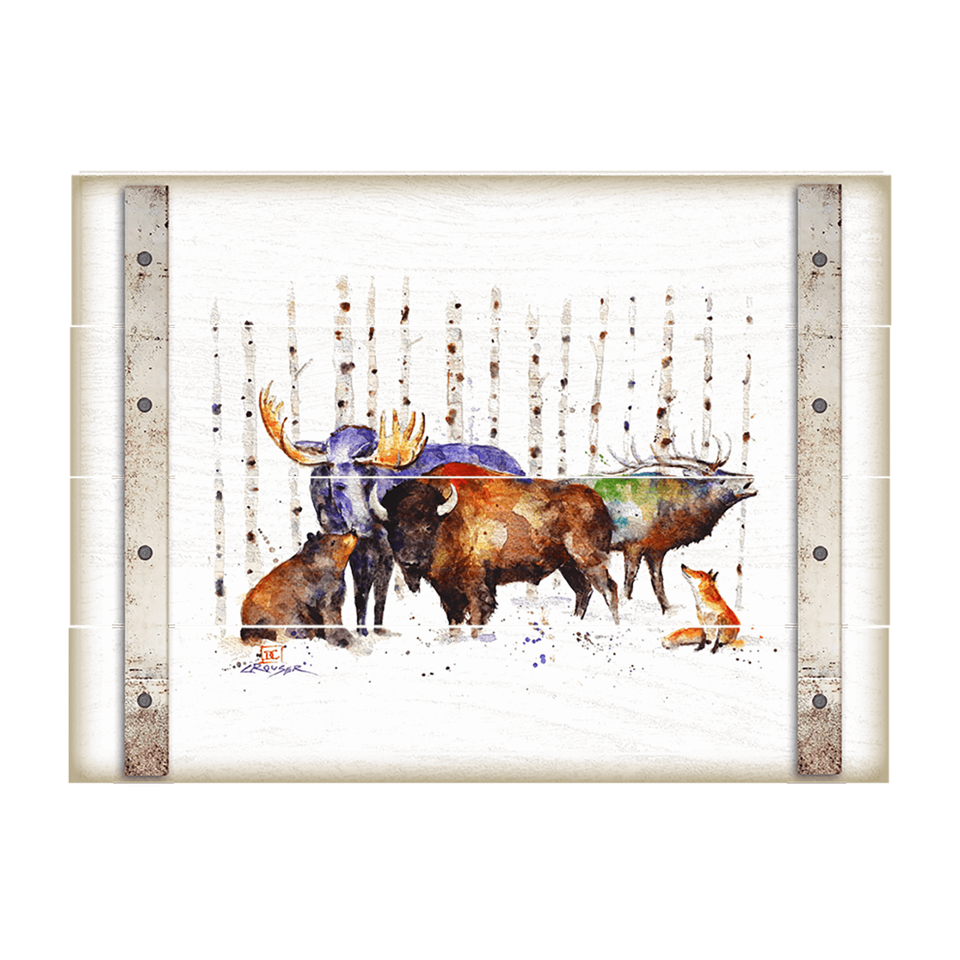 This watercolor painting elegantly depicts a scene of wildlife with a majestic, moose, elk, and bison standing tall amidst a birch forest, accompanied by a curious bear and fox. The blend of natural tones with splashes of color captures the essence of the forest's inhabitants in harmonious coexistence. It's a perfect piece for those looking to bring the spirit of the wild and the serenity of the woods into their living space.