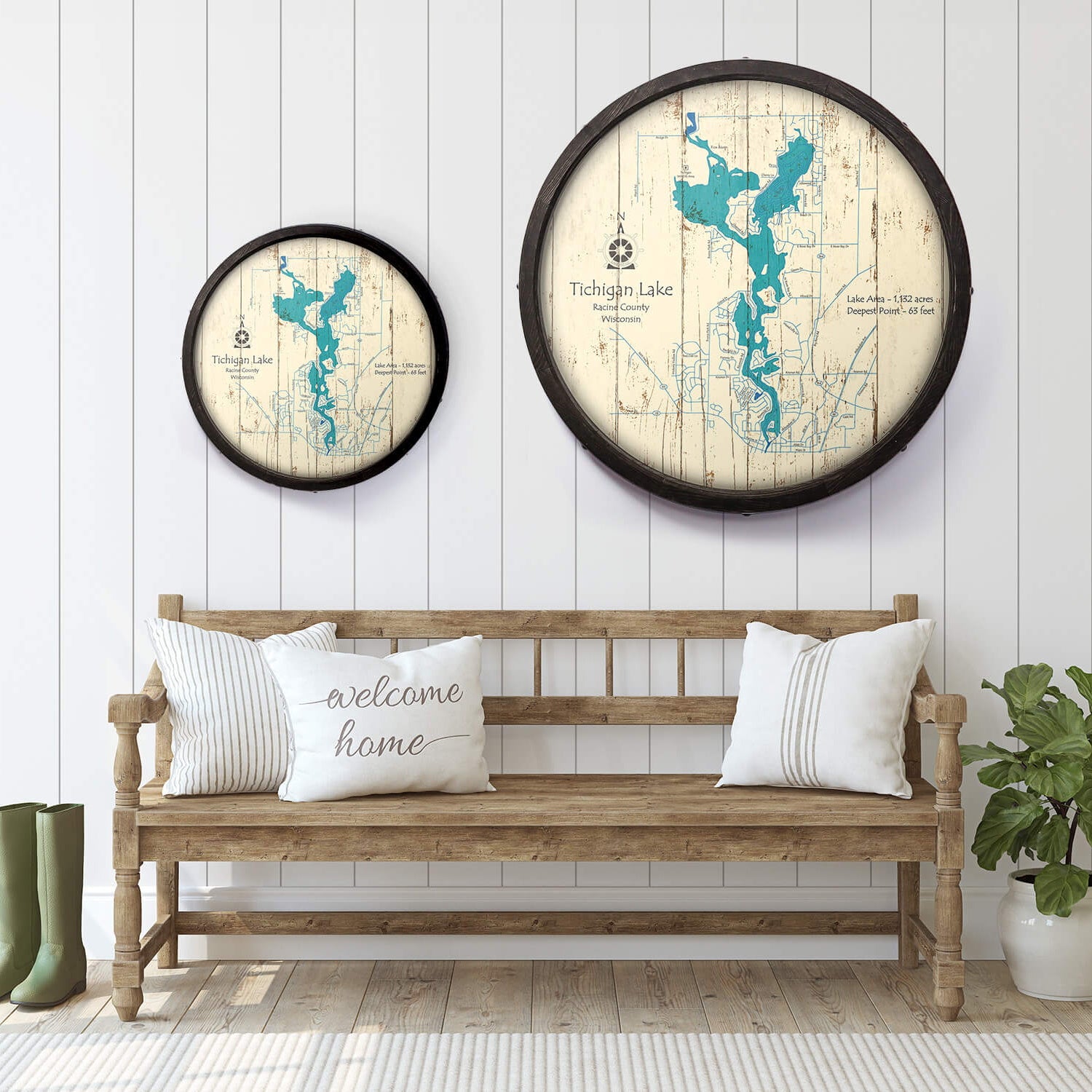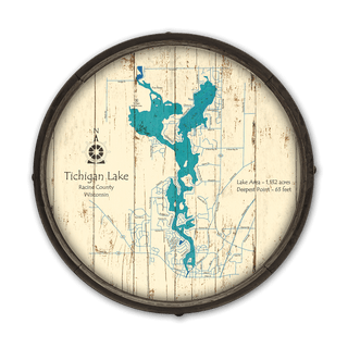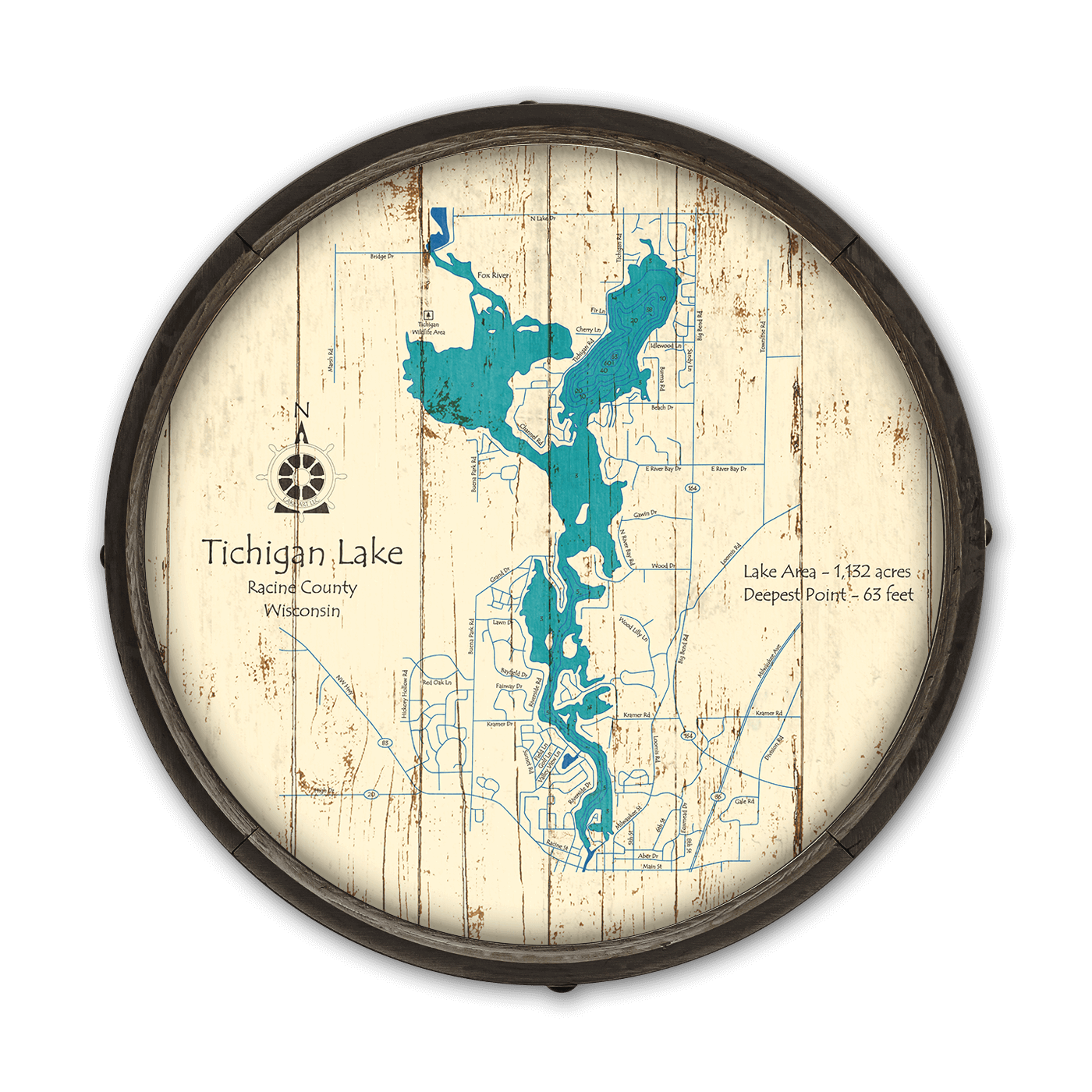 Discover the beauty of Racine County, Wisconsin, through this exquisite artwork of Tichigan Lake. The map captures the intricate waterways and contours of a lake that is not just a body of water but a community's heart. With a surface area of approximately 1,132 acres and depths reaching 63 feet, Tichigan Lake is an angler's dream, known for its bountiful fish and serene waters. The lake is fed by the Fox River on the north and then heads south into Illinois, providing a scenic backdrop for all water activities.