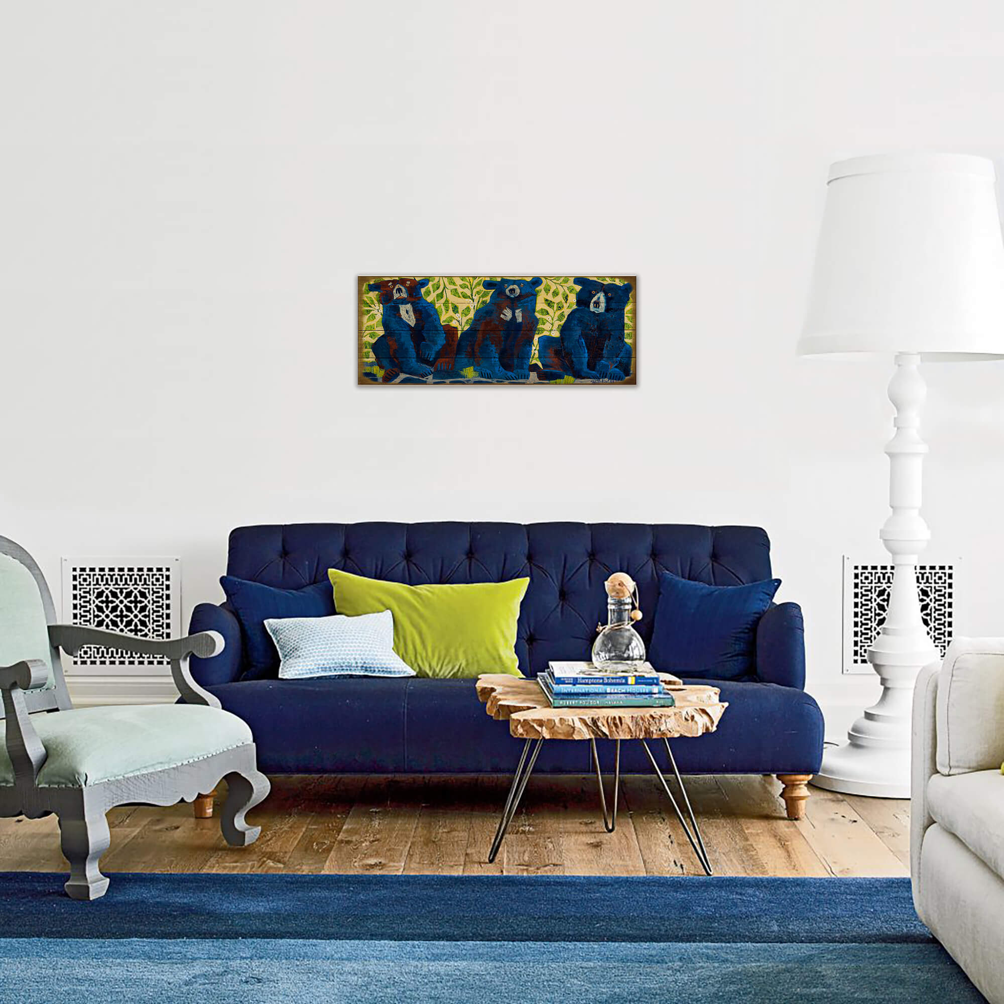 Bring a touch of charm and personality to your space with this delightful artwork of three bears set against a vibrant, leafy backdrop. The rich blue tones of the bears create a striking contrast with the tranquil green and yellow foliage, adding depth and texture to the composition. The whimsical expressions add warmth and personality, making it a perfect piece for nature lovers and those seeking a playful yet sophisticated addition to their decor.