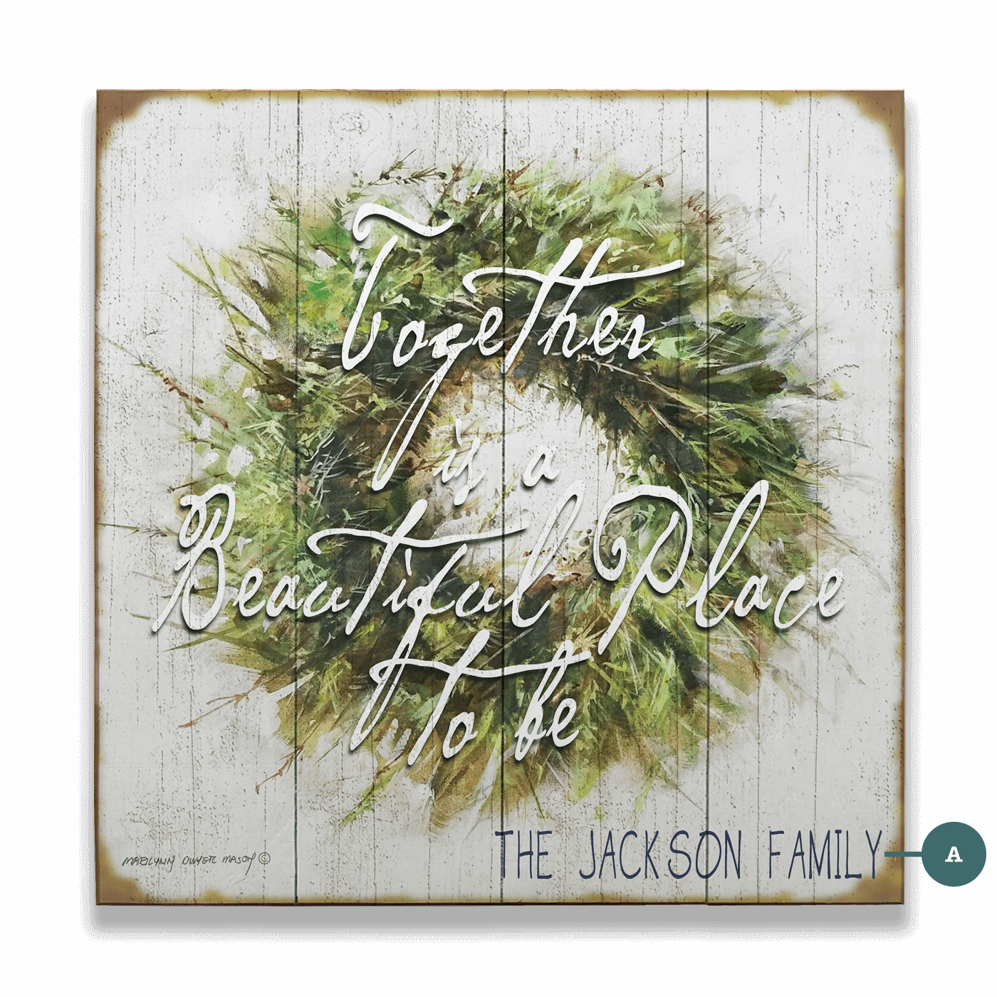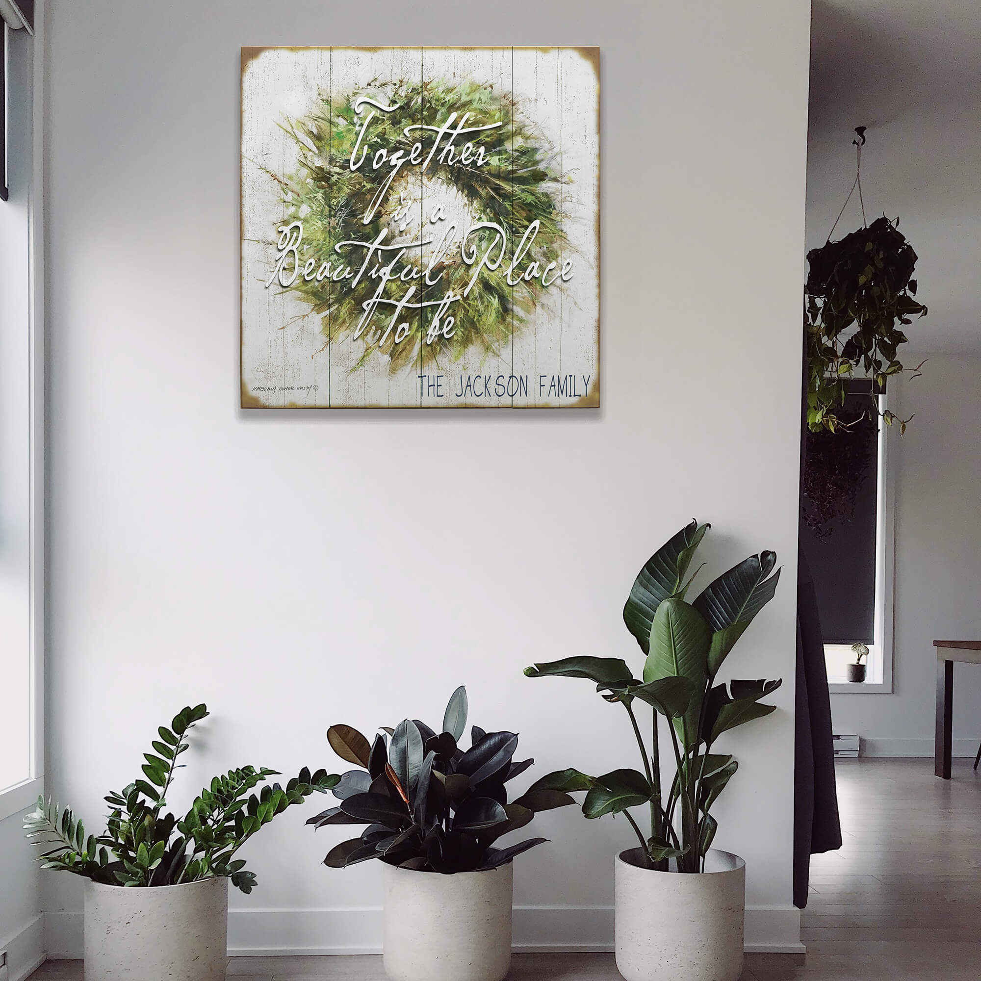 Create a heartfelt ambiance in your home with this exquisite personalized family sign, exuding natural elegance and warmth. This piece features the inspiring quote, "Together is a Beautiful Place to Be," written in graceful calligraphy that dances over a lush backdrop of a watercolor wreath. The detailed foliage, in serene shades of green, brings an organic touch to the rustic charm of the distressed white panel. Perfect for celebrating the unity and love within a home, this customizable sign allows you to add your family name, making it a special keepsake for your living space or an ideal gift for friends and relatives.