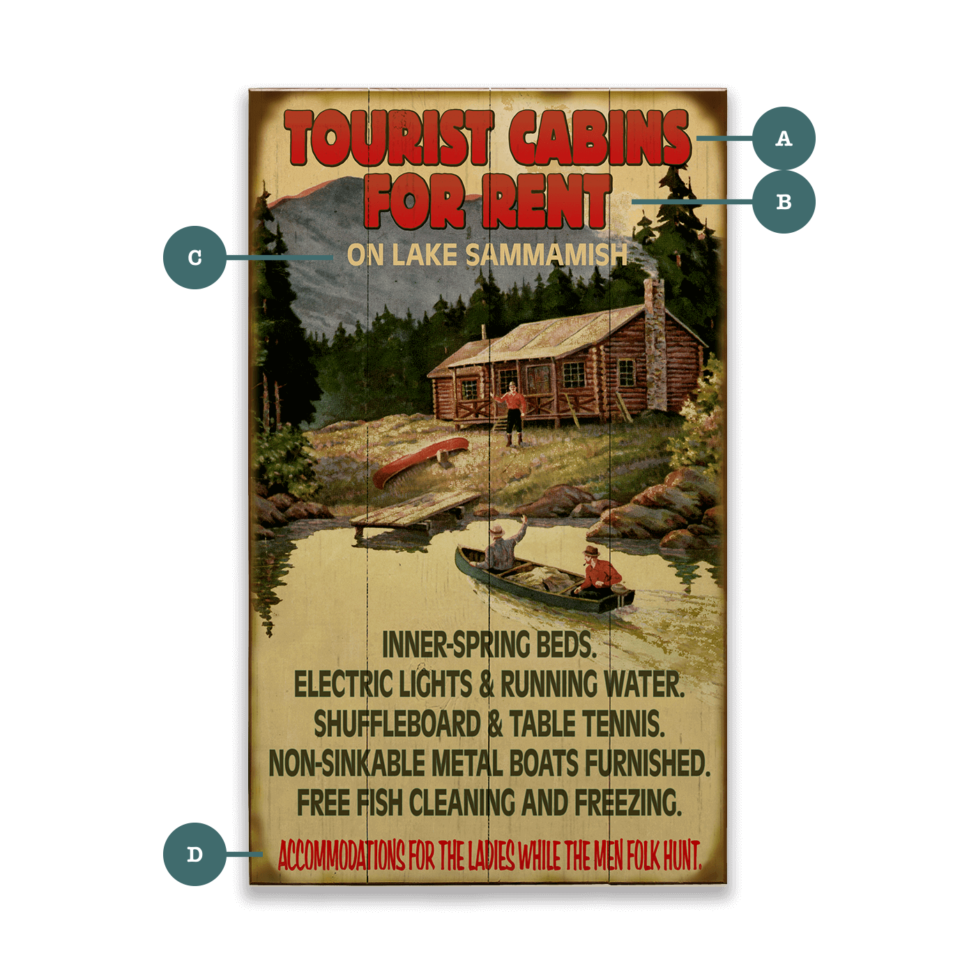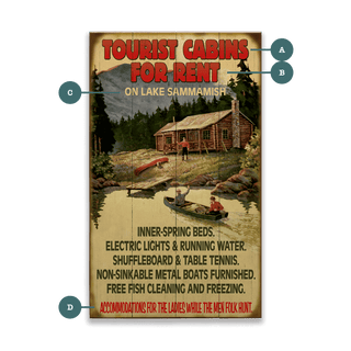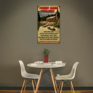 Discover the charm of vintage travel with our "Tourist Cabins for Rent" artworK. This nostalgic piece captures the rustic allure of lakeside cabins, perfect for those seeking a serene getaway. Ideal for adding a touch of retro charm to your home or cabin decor, this sign evokes memories of simpler times and adventurous spirits. Bring the beauty of Lake Sammamish into your space with this delightful, vintage-inspired artwork.