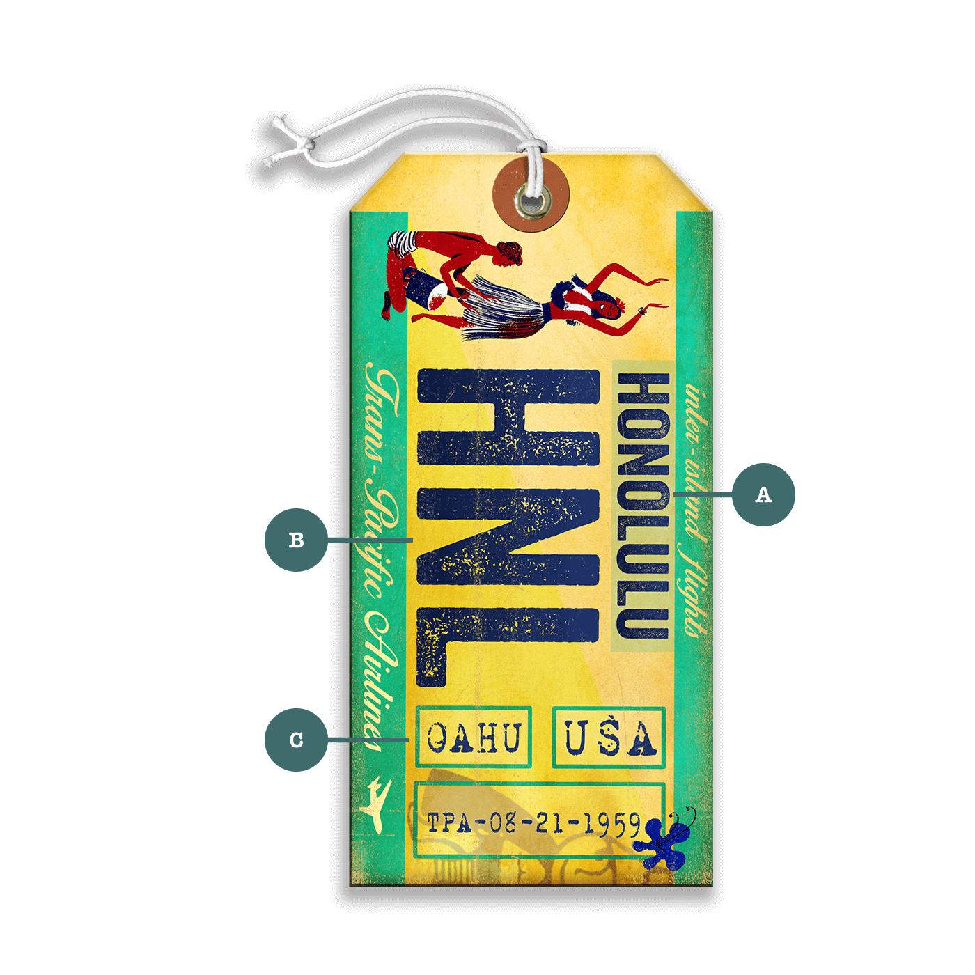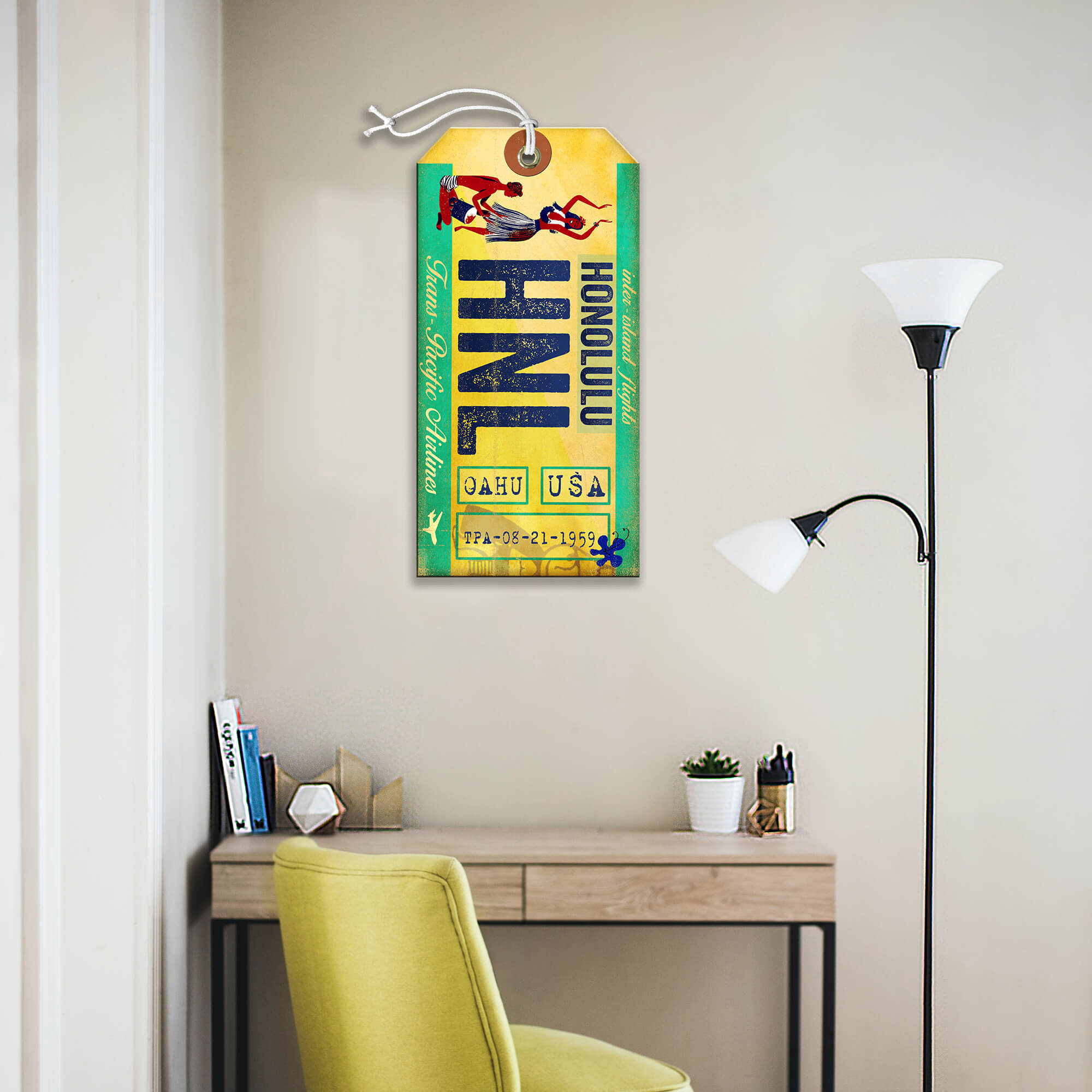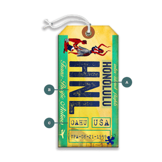 This luggage tag-inspired artwork captures the spirit of classic island travel with a retro flair. Featuring the destination code for Honolulu, Oahu, this piece evokes the nostalgia of mid-century air travel, complete with colorful hula dancers and vintage typography. Whether displayed in a living room, office, or travel-themed decor, this artwork brings a touch of tropical charm and wanderlust to your home.