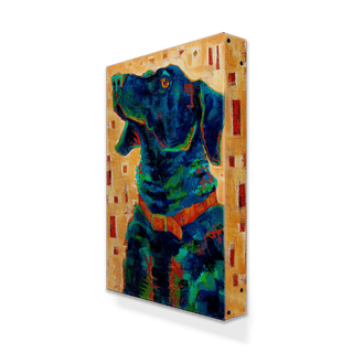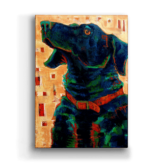This expressive artwork captures the loyal and intelligent essence of a dog, beautifully rendered in deep blues and greens with hints of orange. The warm, patterned background enhances the composition with subtle contrast and modern flair. The piece radiates warmth and personality, celebrating the spirit of canine companions. Perfect for animal lovers, this artwork adds a striking yet heartfelt touch to any space.