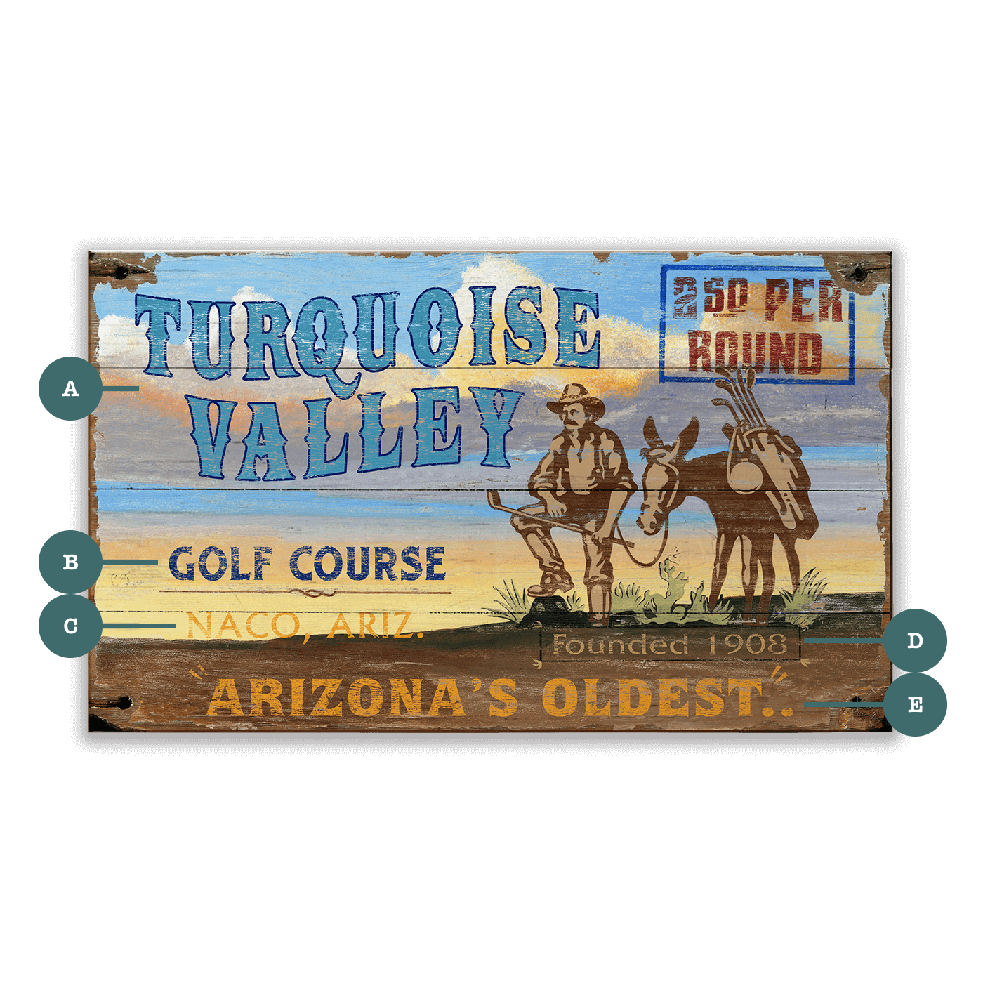 This vintage-style artwork showcases the charm of an old western golf course with a weathered, nostalgic appeal. Featuring hand-painted typography and a rustic scene of a cowboy golfer alongside his pack mule, the design blends frontier heritage with the leisurely sport of golf. The distressed finish and faded hues give it an authentic, timeworn look, evoking the early days of Arizona’s golfing history. Perfect for collectors, western decor enthusiasts, or those who appreciate unique Americana, this piece adds character and a touch of humor to any space.