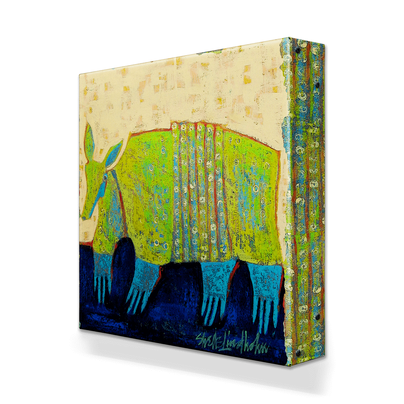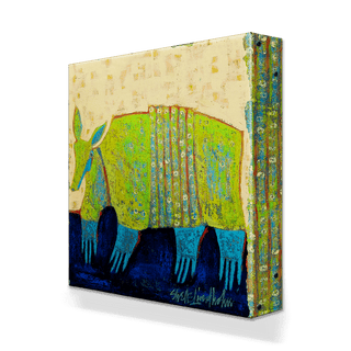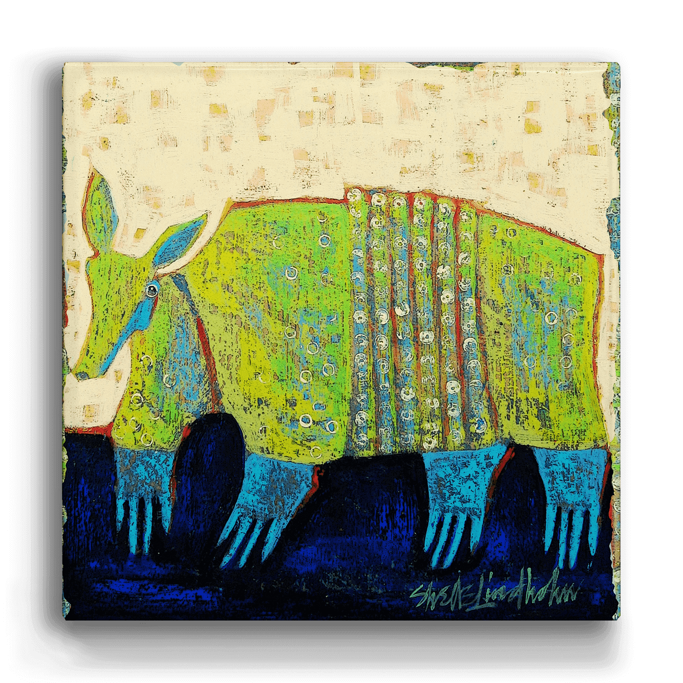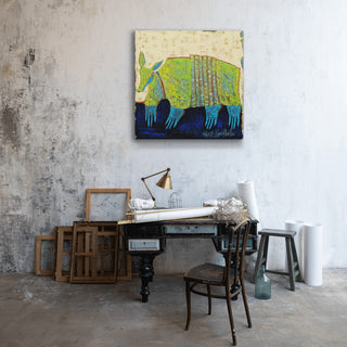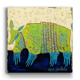 Add a playful yet elegant charm to your decor with this whimsical artwork featuring a stylized armadillo, brought to life in vibrant greens and blues against a textured, neutral backdrop. The intricate patterns on its shell highlight the unique beauty of this fascinating creature, while the rich, dark blue ground adds depth and contrast. Perfect for nature enthusiasts and lovers of distinctive art, this captivating work celebrates the armadillo’s quiet strength and charm in a striking, imaginative way.
