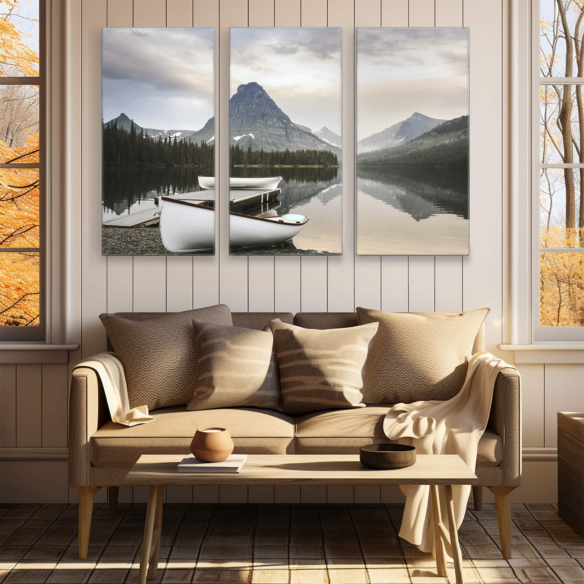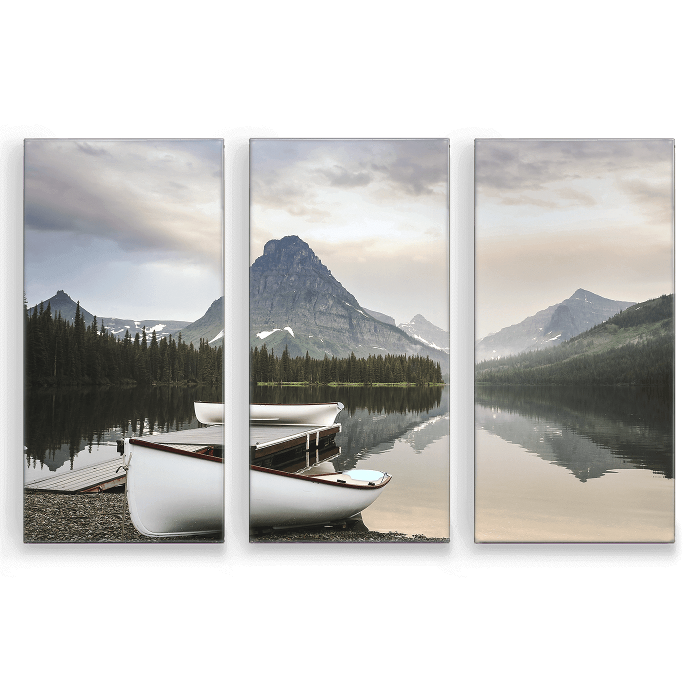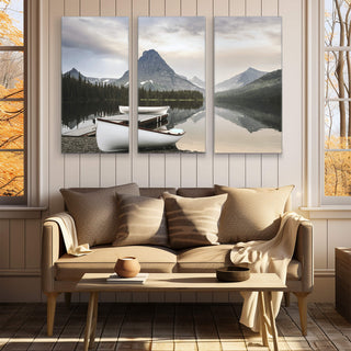 Enjoy the tranquil beauty of Two Medicine Lake with this serene triptych wall art from Glacier National Park. This piece elegantly captures the early morning stillness of the lake, with canoes resting gently on the water's edge, ready for the day's adventures. The majestic peaks of the surrounding mountains are beautifully reflected in the mirror-like surface of the lake, creating a perfect symphony of nature's splendor. Ideal for those who cherish the peaceful moments in the great outdoors, this artwork brings the calming essence of Two Medicine Lake into any living space or office.