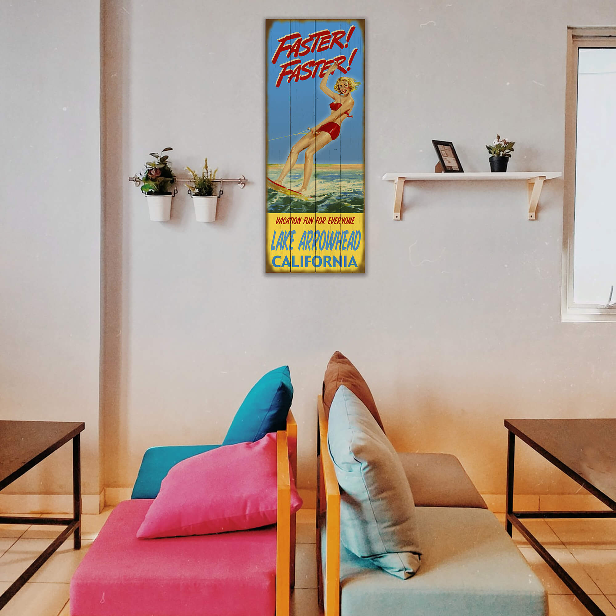 Featuring a vibrant design with a family enjoying a scenic boat ride, this artwork evokes a sense of adventure and relaxation on the water. The bold, colorful lettering and nostalgic style make it a perfect addition to any decor, ideal for homes, offices, or businesses looking to add a touch of retro flair.
