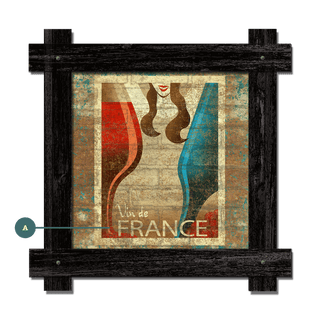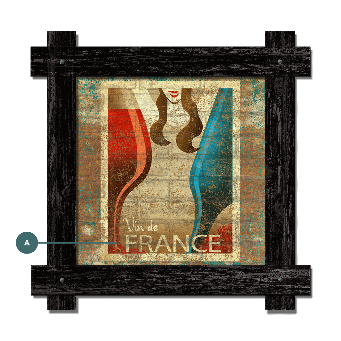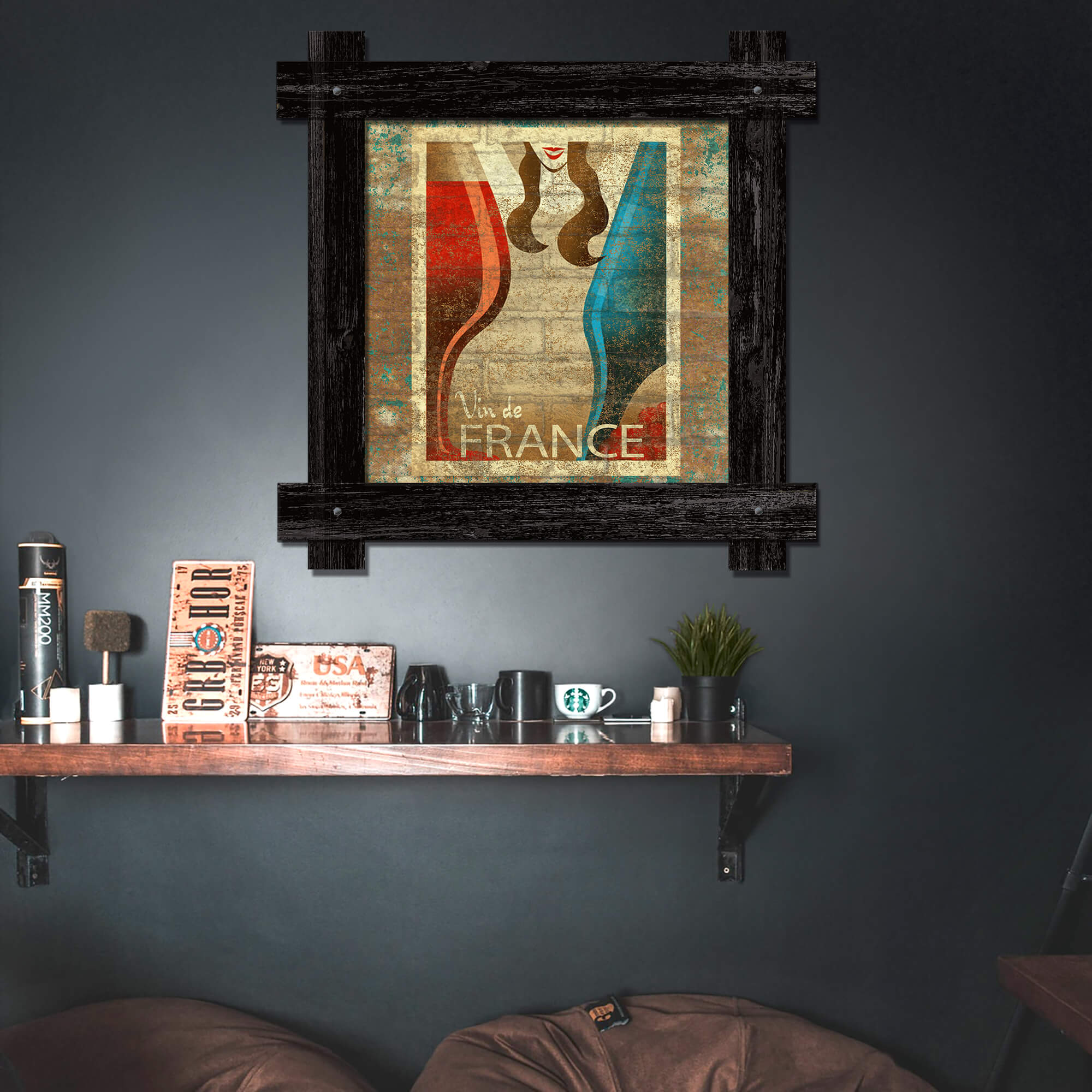 The artwork is encased in a robust black frame, reminiscent of reclaimed wood, which adds depth and character to the piece. The background boasts a textured brick-like design, giving the impression of an old-world wine cellar. Feel like you are in that little bistro in Paris that you love.