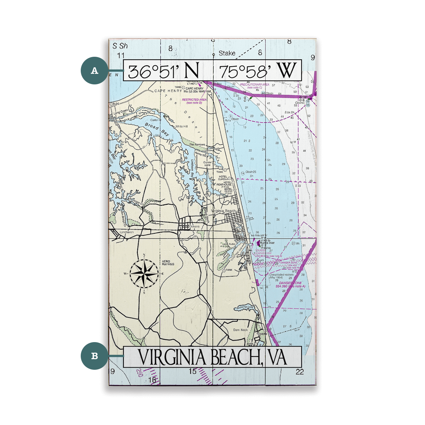This nautical chart artwork of Virginia Beach, Virginia, highlights the dynamic meeting point of Chesapeake Bay and the Atlantic Ocean. With detailed coastal features including Cape Henry, Broad Bay, and the bustling boardwalk area, this region is steeped in maritime history and military significance. Popular for fishing, sailing, and beachside escapes, Virginia Beach offers a blend of natural beauty and nautical tradition. The name and coordinates can be customized, making it a distinctive way to commemorate your connection to this iconic stretch of shoreline.
