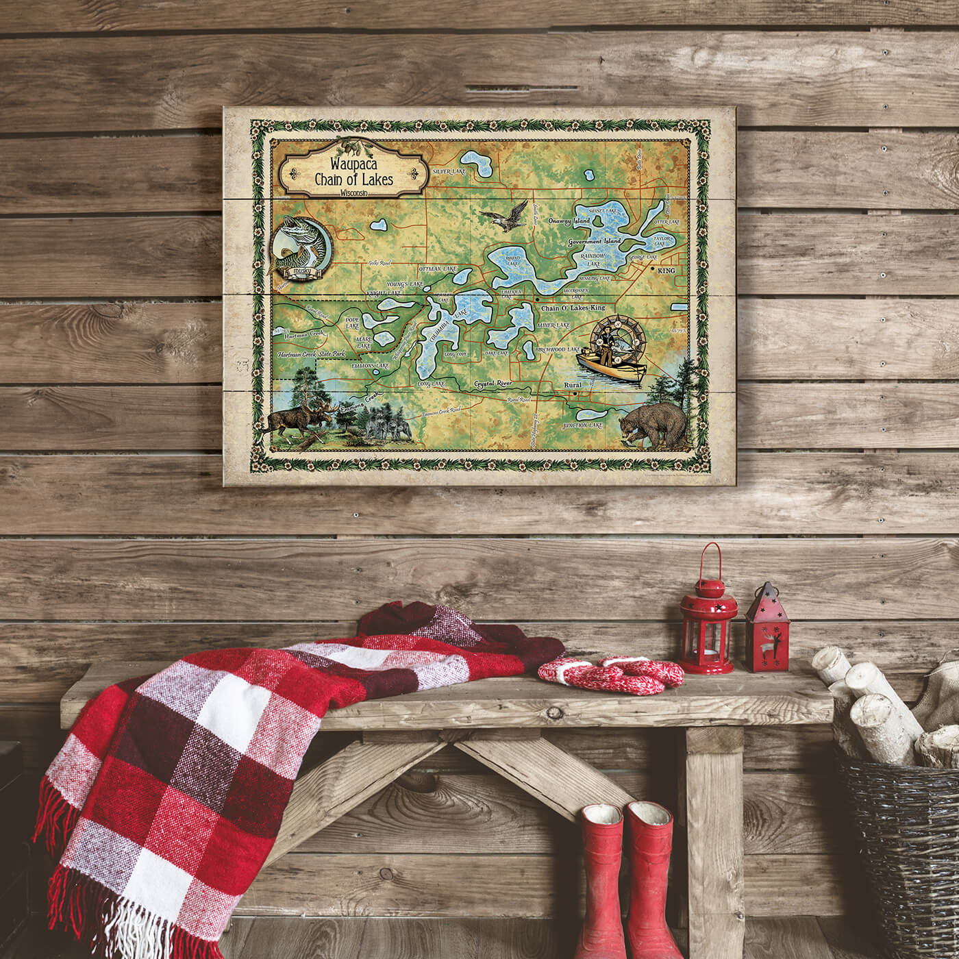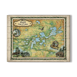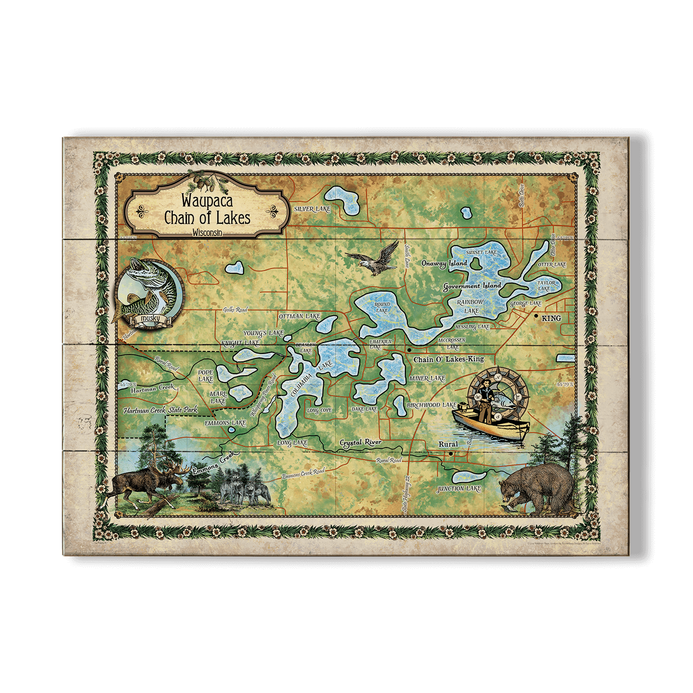 Immerse yourself in the serene beauty of the Waupaca Chain of Lakes with this detailed and artistically rendered map. Celebrating Wisconsin's beloved waterways, this map features the interconnected lakes and surrounding areas, beautifully illustrated with local wildlife and boating scenes that capture the essence of outdoor life in Waupaca. Rich in detail and vibrant in color, this piece is perfect for anyone who cherishes the natural landscapes of Wisconsin or seeks a picturesque reminder of lake life.