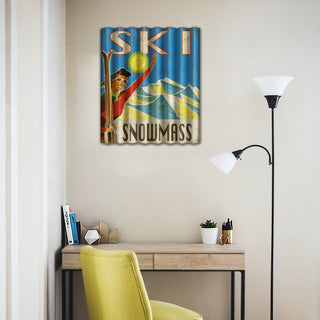This vibrant artwork captures the retro charm of alpine adventure with its bold colors and nostalgic design. Featuring a cheerily waving skier against a backdrop of majestic snow-capped peaks and a radiant sun, it emanates the energy and excitement of hitting the slopes. The distressed finish adds a vintage touch, making it a perfect addition to any space celebrating the golden age of skiing. Ideal for mountain enthusiasts, lodge decor, or anyone who loves the timeless allure of winter sports, this piece is a lively tribute to the joy and glamour of the ski lifestyle.
