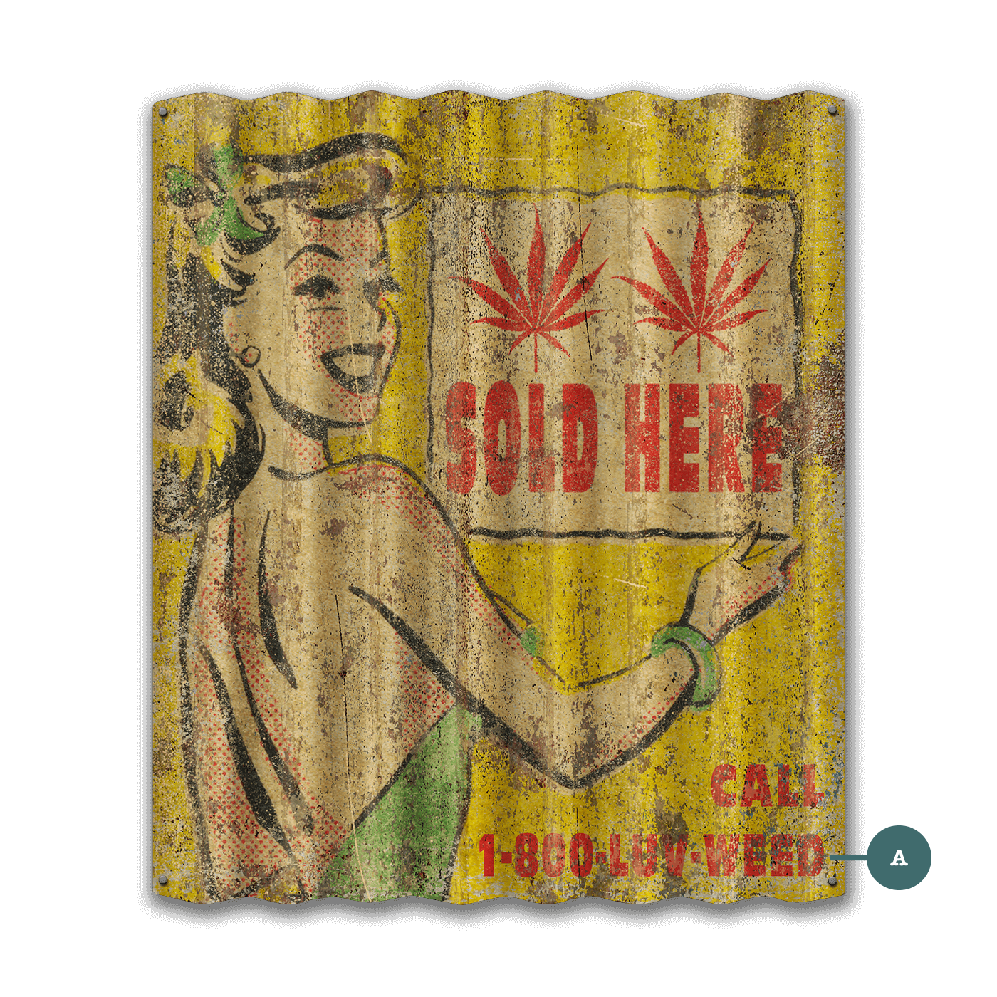 Step into a bygone era with this vintage-inspired metal sign, a nod to the retro days with a modern twist. This eye-catching piece marries classic Americana with contemporary cannabis culture, featuring a cheerful pin-up pointing towards bold text that announces SOLD HERE alongside the unmistakable cannabis leaf symbols. Perfect for adding a touch of nostalgic flair to your dispensary, smoke shop, or personal den, this sign is a playful statement in any setting. Made to look weathered, it carries a sense of history and authenticity, ideal for those who appreciate the art of yesteryear with a present-day relevance. This unique piece is sure to spark conversations and add a quirky charm to your wall décor collection. Personalize the last line to make your own unique piece of art.