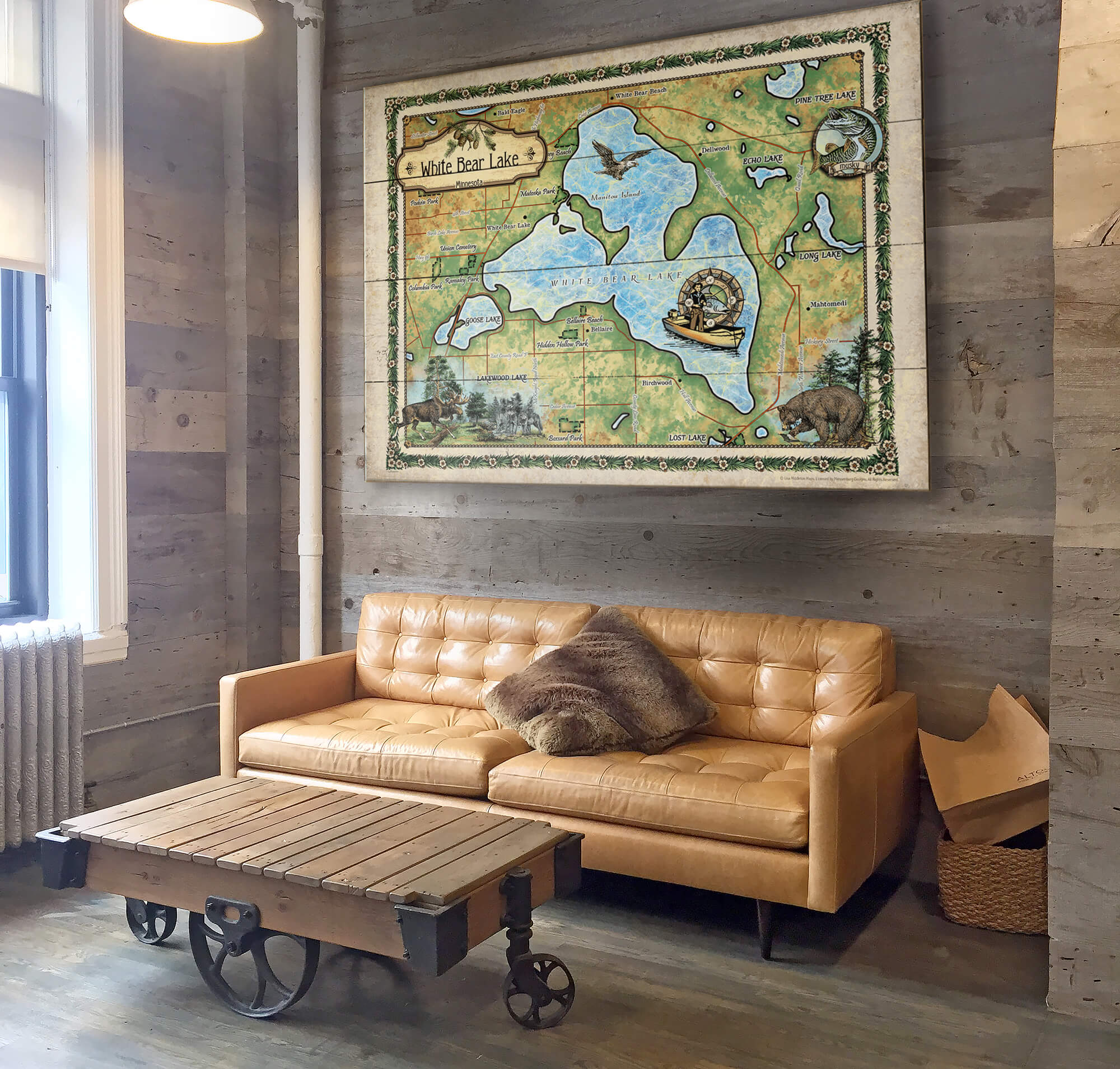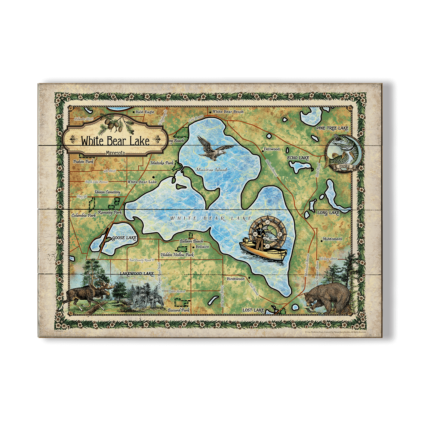 This exquisite map of White Bear Lake, Minnesota, captures the rustic charm and scenic beauty of the region. Perfect for collectors and enthusiasts alike, this artwork features detailed illustrations of local flora and fauna, and historic sites, all framed by a classic decorative border. Ideal for home decor or as a unique gift, this map brings a touch of Minnesota’s natural elegance right into your living space. Discover the magic of White Bear Lake through this artistic and geographical masterpiece.