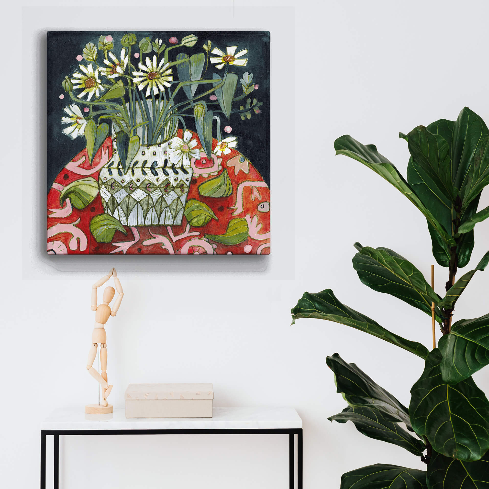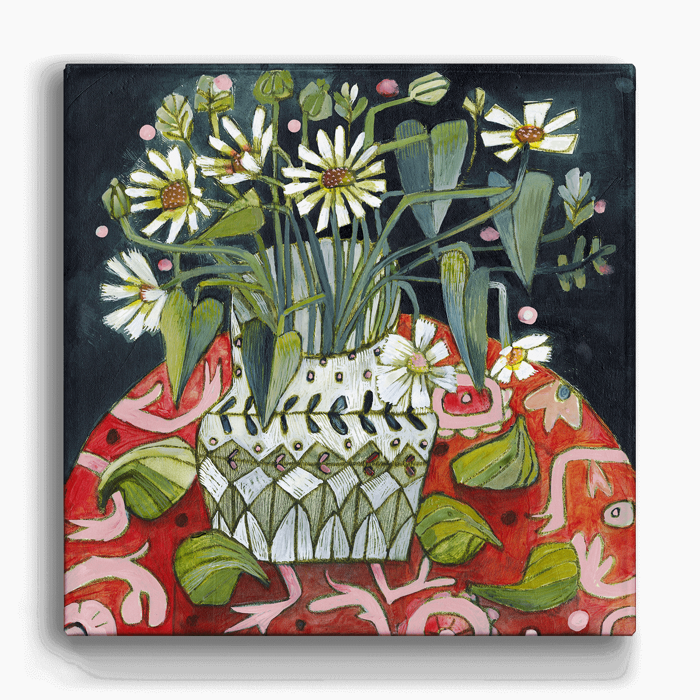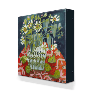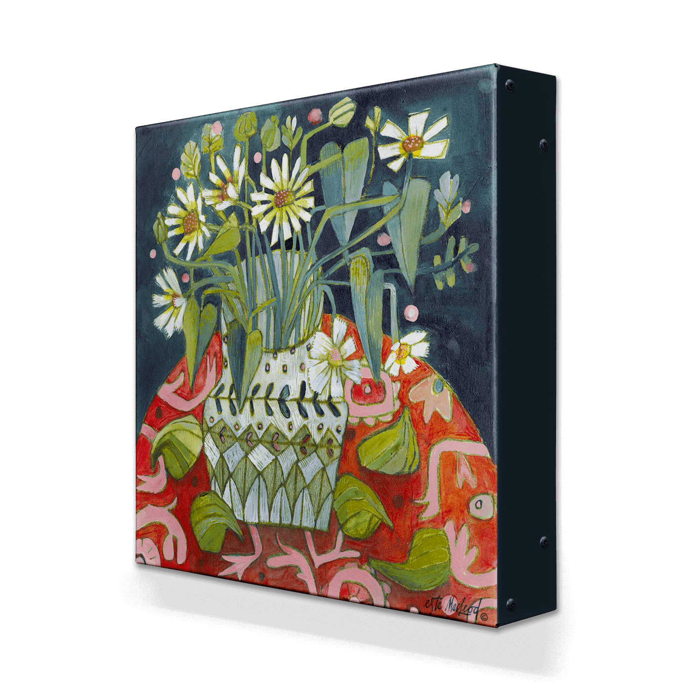 "White Flowers" by Este MacLeod is a compelling box-art piece that blends the delicacy of floral beauty with a striking textile-inspired backdrop. Printed on aluminum, this work juxtaposes the purity of white blossoms against a vividly patterned surface, showcasing Este's talent for uniting stylized forms with rich, layered textures. This piece reflects her blend of real and imaginary influences, offering an eye-catching and whimsical addition to any art collection that appreciates a touch of whimsy and a vibrant aesthetic.