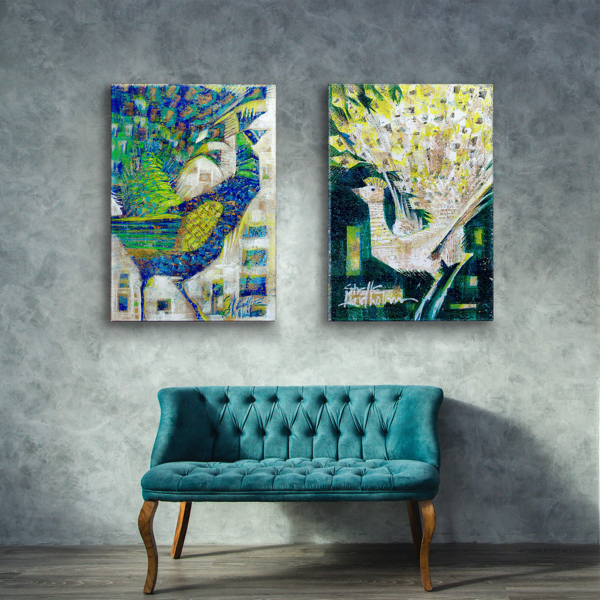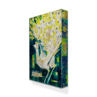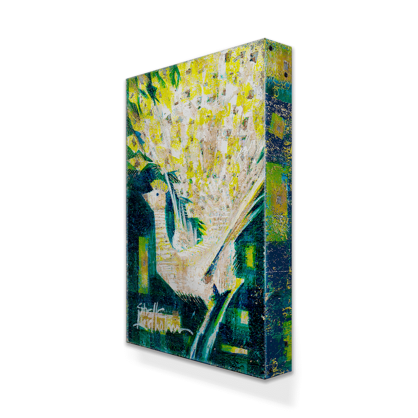 Bring elegance and light to your space with this captivating artwork of a white peacock fanning its feathers against a lush green backdrop. The soft, textured details and vibrant palette create a sense of movement and grace, making it a perfect centerpiece for any room. Ideal for art lovers seeking a blend of sophistication and natural beauty.