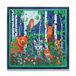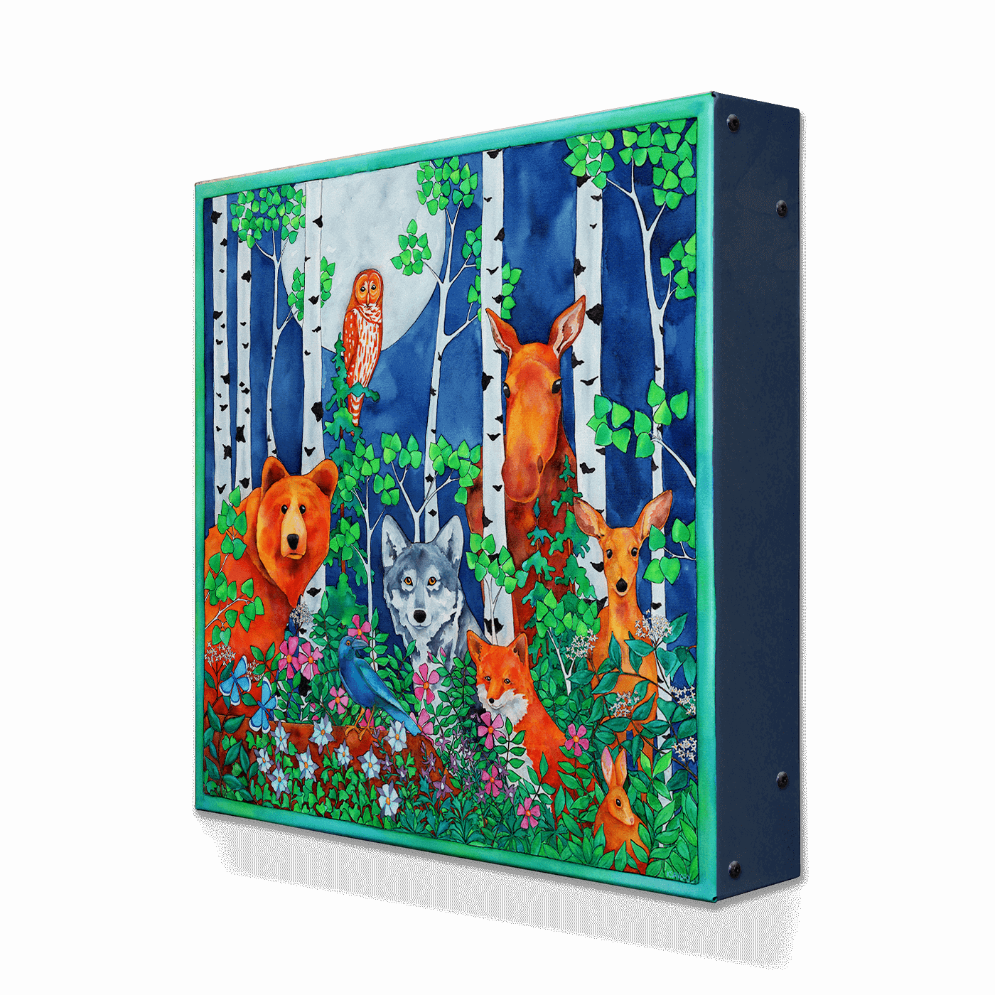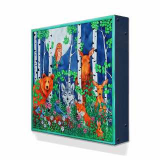 This vibrant watercolor painting that captures a lively scene of woodland creatures including a bear, wolf, deer, fox, owl, moose, rabbit, and a bird, in a lush, blooming forest. Set against a backdrop of stark white birch trees with vivid green foliage, this artwork is bursting with color and life, making it a captivating addition to any space. Ideal for nature lovers and those who appreciate the beauty and diversity of wildlife, this piece brings the enchantment of a forest's ecosystem into your home, offering a window to a world where different species live together in peace.