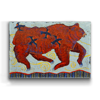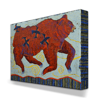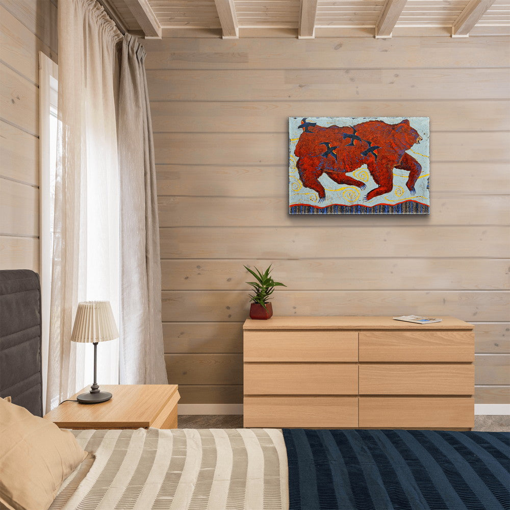 This dynamic artwork depicts a powerful bear in motion, accompanied by playful, soaring red-winged blackbirds. The rich, orange tones of the bear contrast beautifully with the muted blue background, accented by swirls of yellow, creating a sense of energy and the untamed spirit of the wild. Perfect for adding a statement of vitality and artistry to any space, this piece captures the essence of the wilderness in a contemporary style.