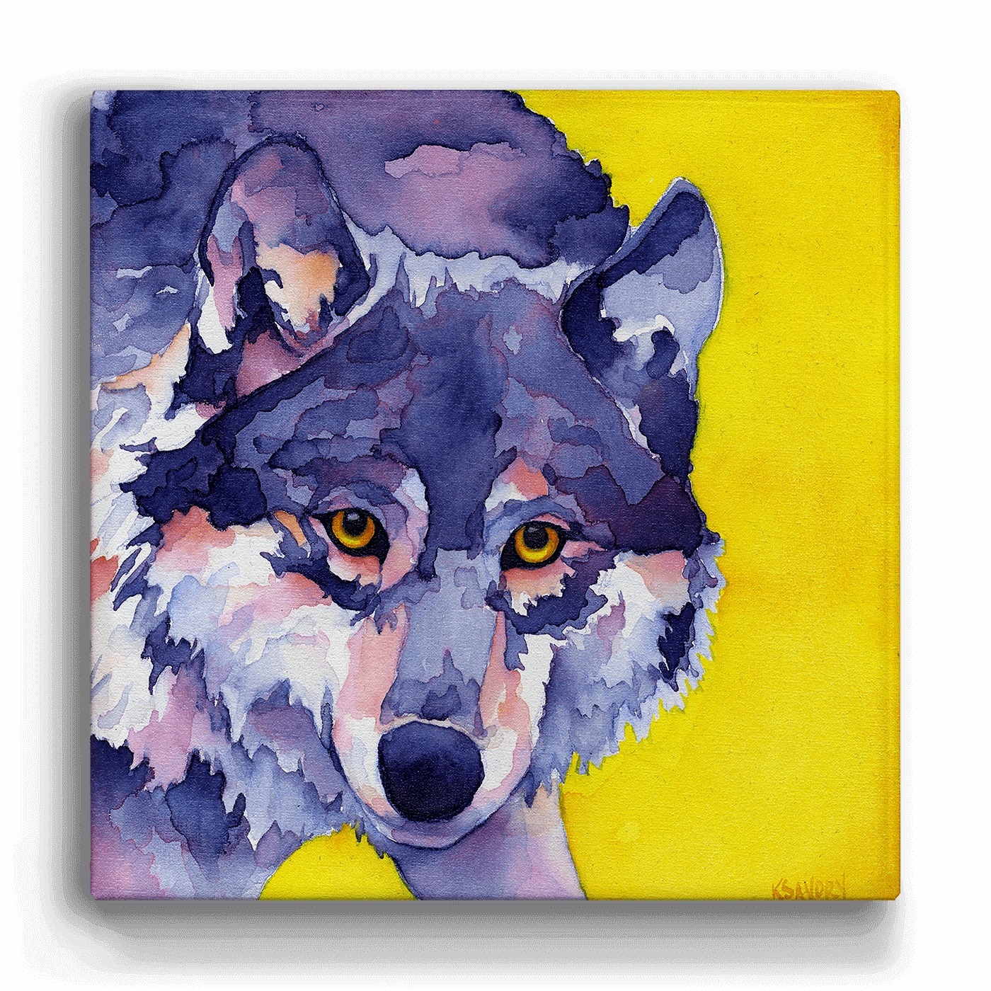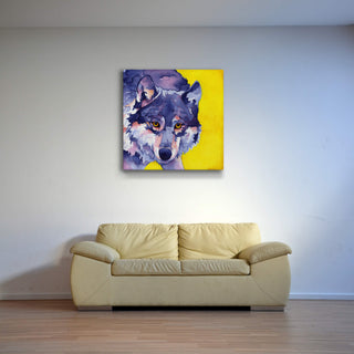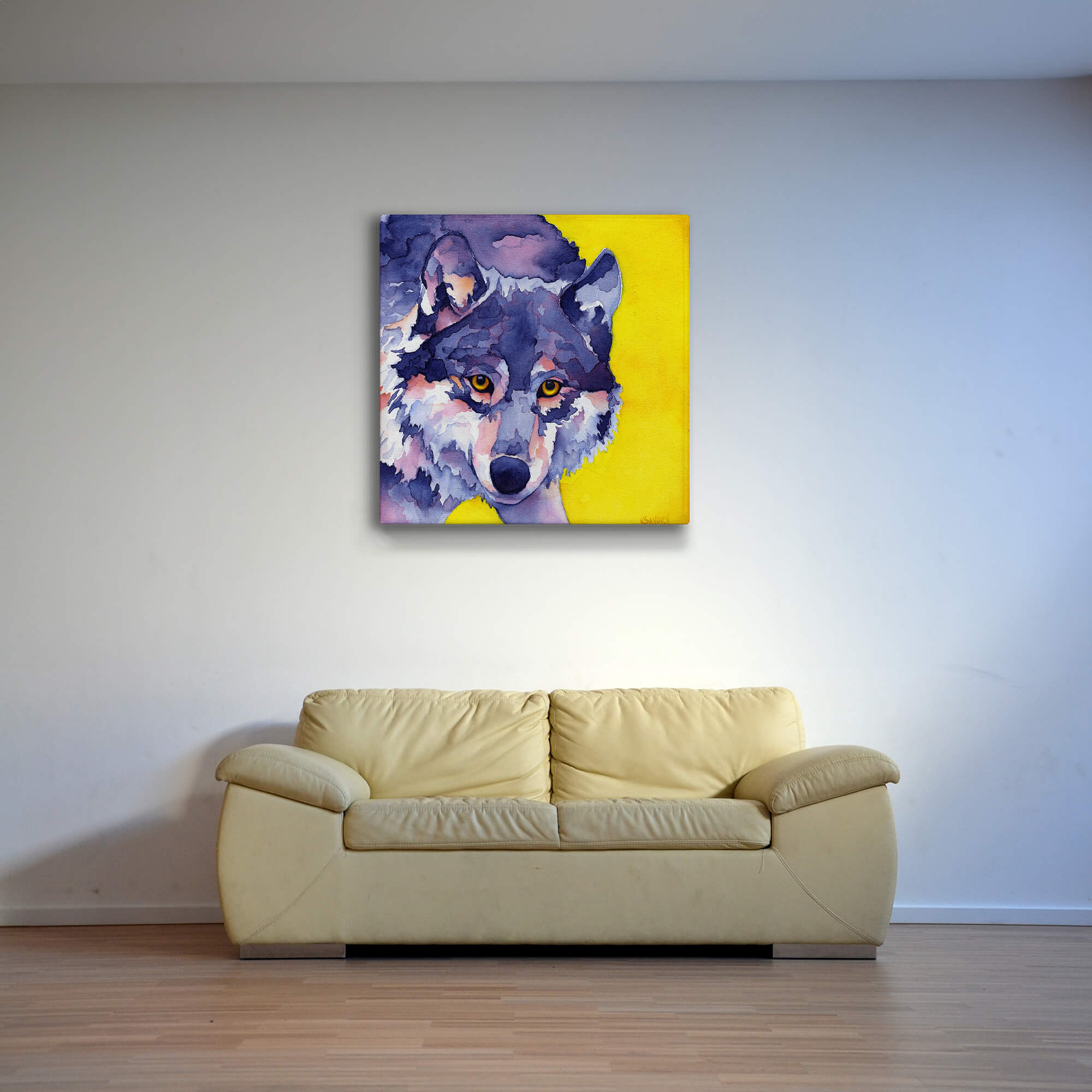 Immerse yourself in the wild beauty of this stunning wolf portrait, a vibrant masterpiece that captures the intense gaze and intricate textures of one of nature's most enigmatic creatures. Rendered in bold watercolors, the artwork contrasts deep, cool hues with a vivid yellow background, highlighting the wolf's piercing eyes and layered fur. Perfect for wildlife enthusiasts or anyone looking to add a touch of nature-inspired drama to their home decor, it brings the spirit of the wilderness into your living space.