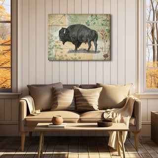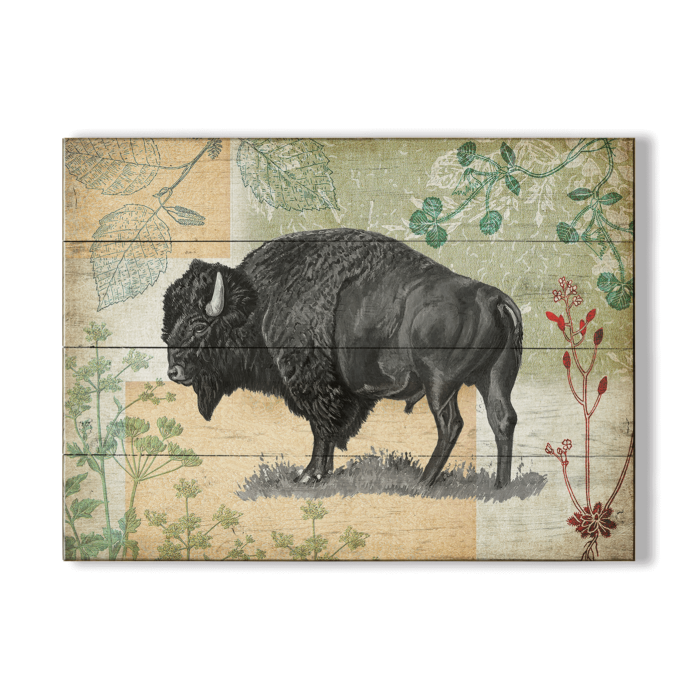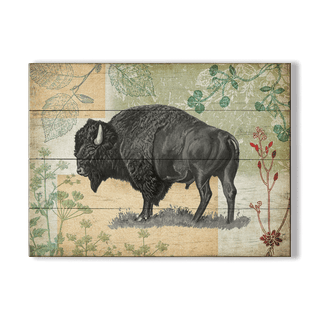 The bison, often regarded as a symbol of abundance and manifesting strength, stands boldly as the centerpiece of this artwork. This piece captures the raw beauty and magnificence of the bison, contrasted elegantly against a rich tapestry of plant life. The illustrative portrayal promises a dash of wild and rustic charm to your living space.