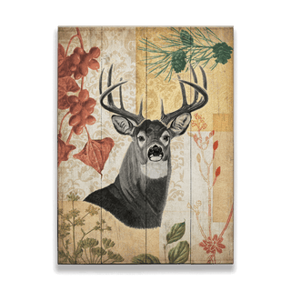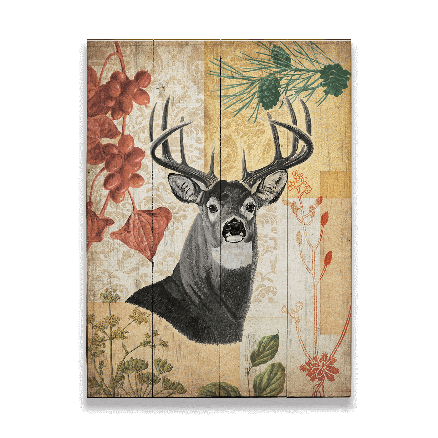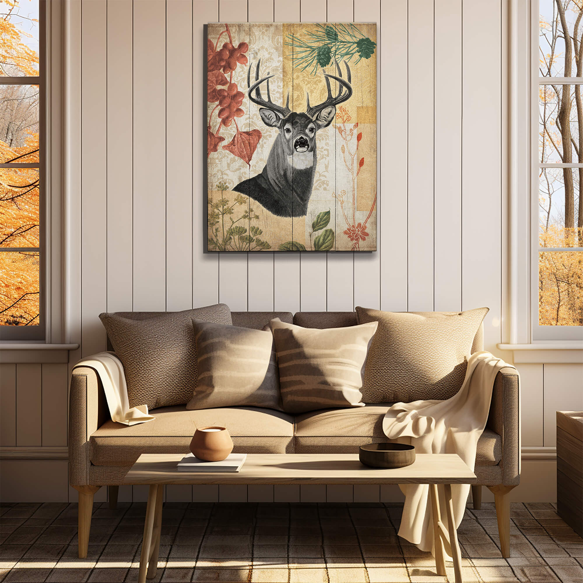This whitetail deer artwork captures the elegance and gentleness of this forest inhabitant. The deer, gracefully posed amidst a collage of forest trees and plants, evokes a sense of serene beauty. This piece serves as a gentle reminder of the quiet charm of the forest, making it an exquisite addition to any collection.
