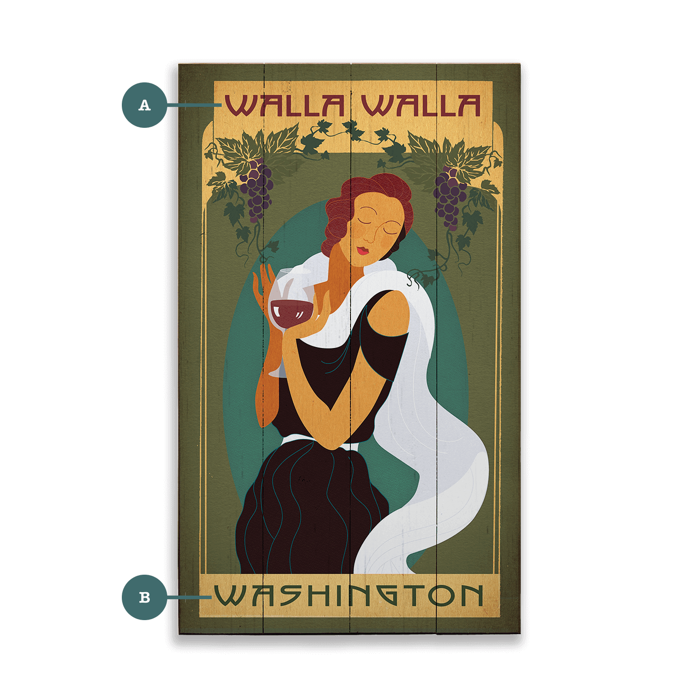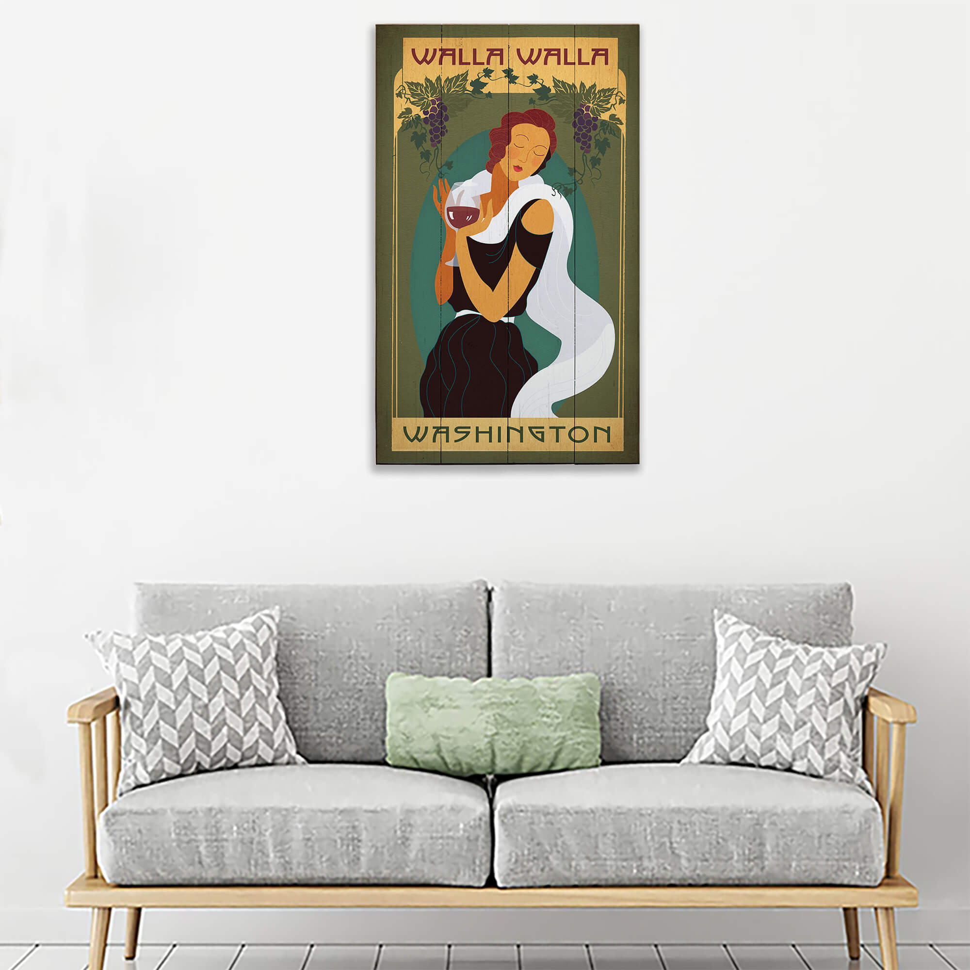 Immerse yourself in the blissful world of Walla Walla, Washington with this beautifully crafted artwork. It features an elegant figure cradling a glass of wine, surrounded by lush grapevines, capturing the essence of the region's renowned winemaking tradition. Ideal for wine enthusiasts and art lovers alike, this piece adds a touch of sophistication and local charm to any space.