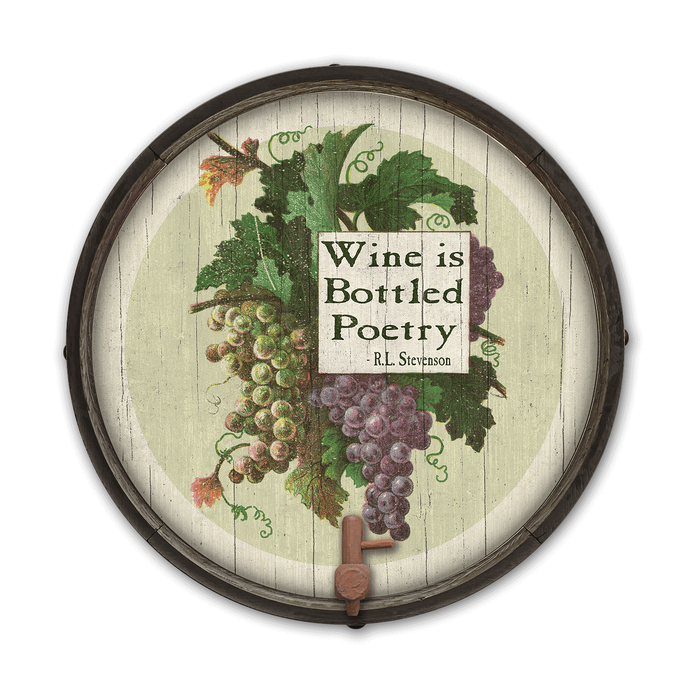 Immerse yourself in the art of winemaking with this elegant 'Wine is Bottled Poetry' artwork, inspired by the words of R.L. Stevenson. Perfectly capturing the essence of wine as a blend of art and science, this piece features a vibrant cluster of grapes against a rustic barrel background. Ideal for wine lovers and connoisseurs, it adds a touch of literary charm and sophistication to any room. Whether displayed in your home, wine cellar, or as a gift to a fellow wine enthusiast, this artwork serves as a beautiful reminder of the poetic nature of wine.