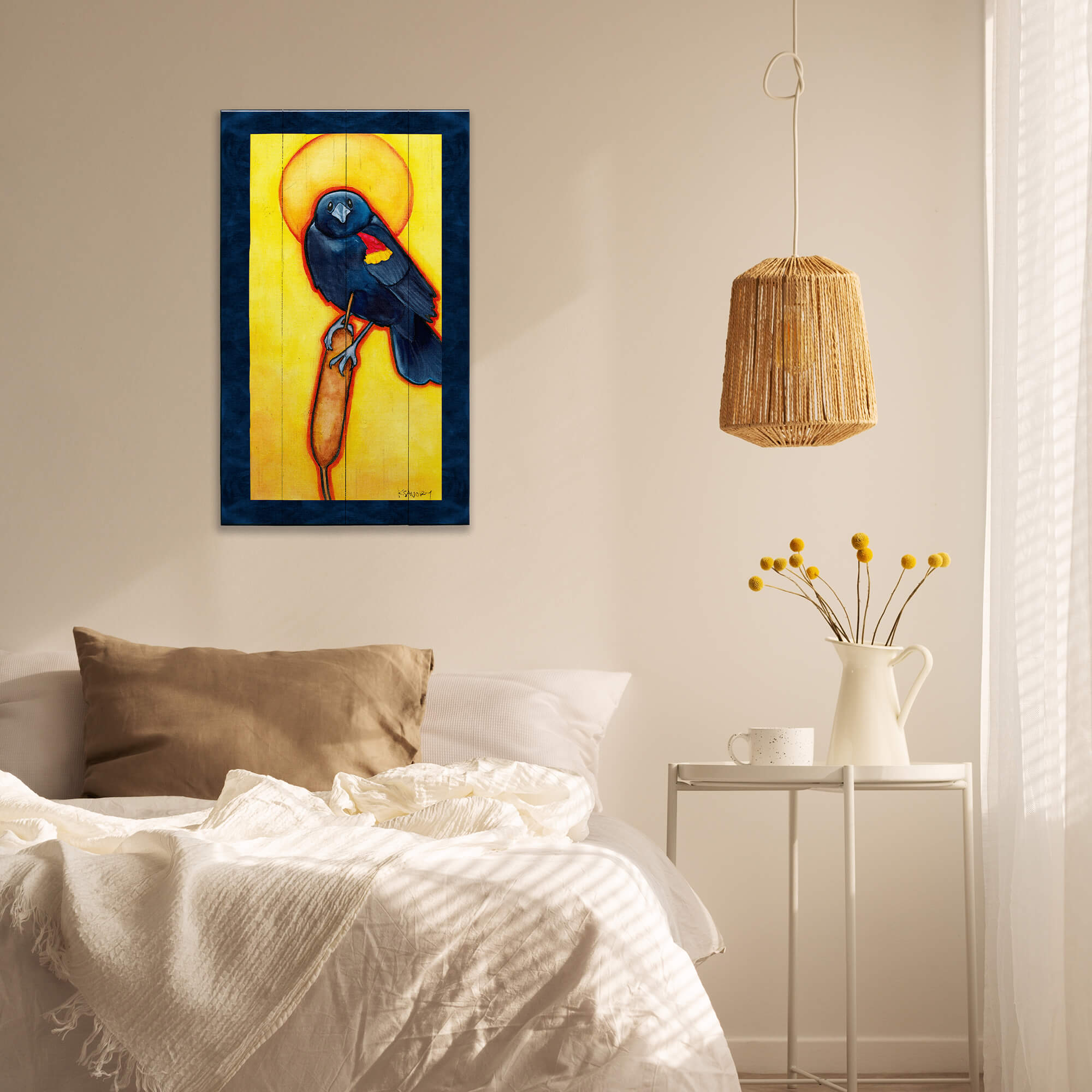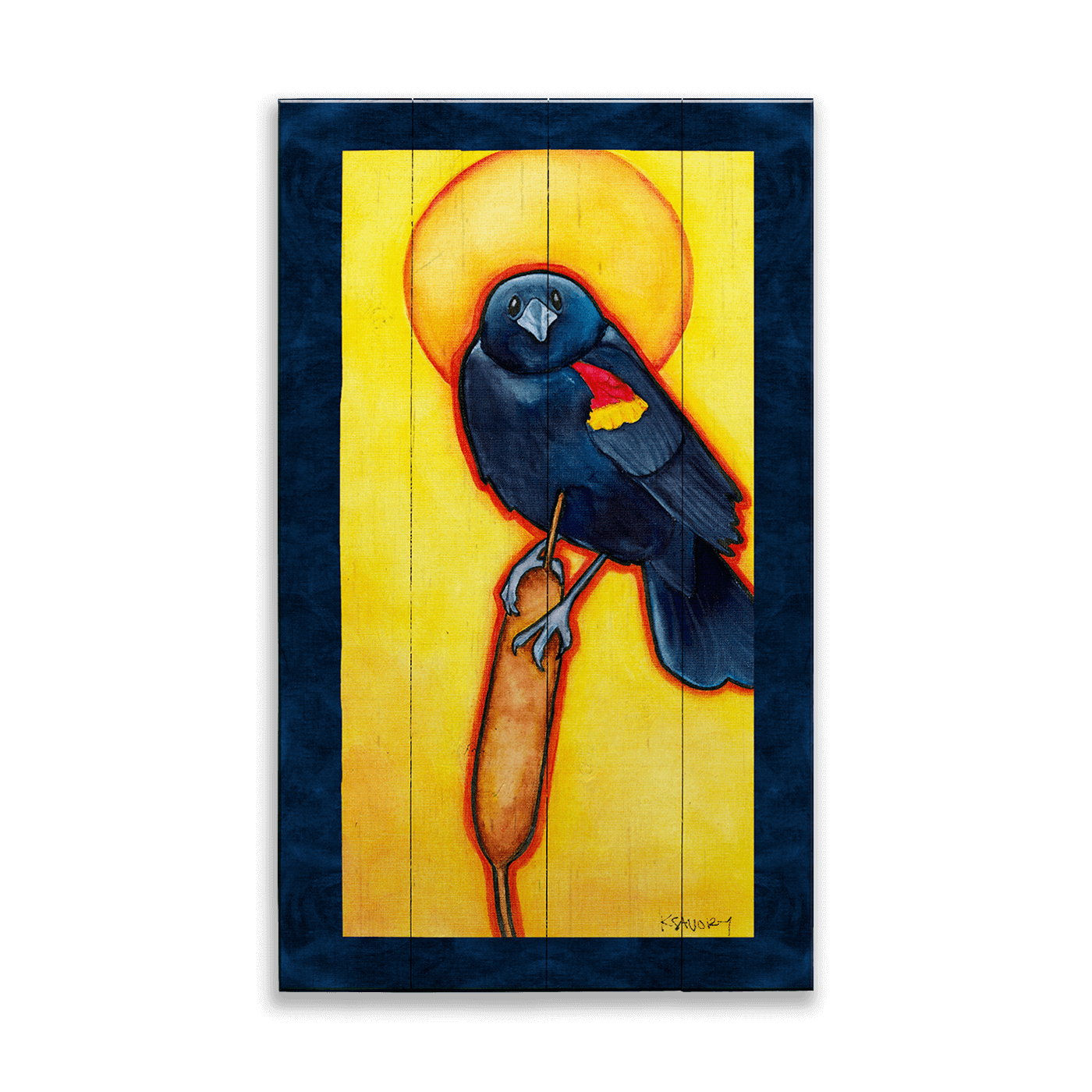 Illuminate your space with this striking artwork of a red-winged blackbird perched gracefully on a cattail, bathed in the golden glow of a radiant, sunny halo. The bold contrast of deep blue-black against vibrant yellows brings this elegant bird to life, evoking a sense of majesty and reverence for nature's beauty. Perfect for bird lovers and art enthusiasts alike, this piece captures the drama of wildlife in a modern, spiritual style.