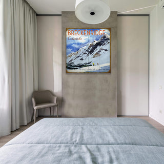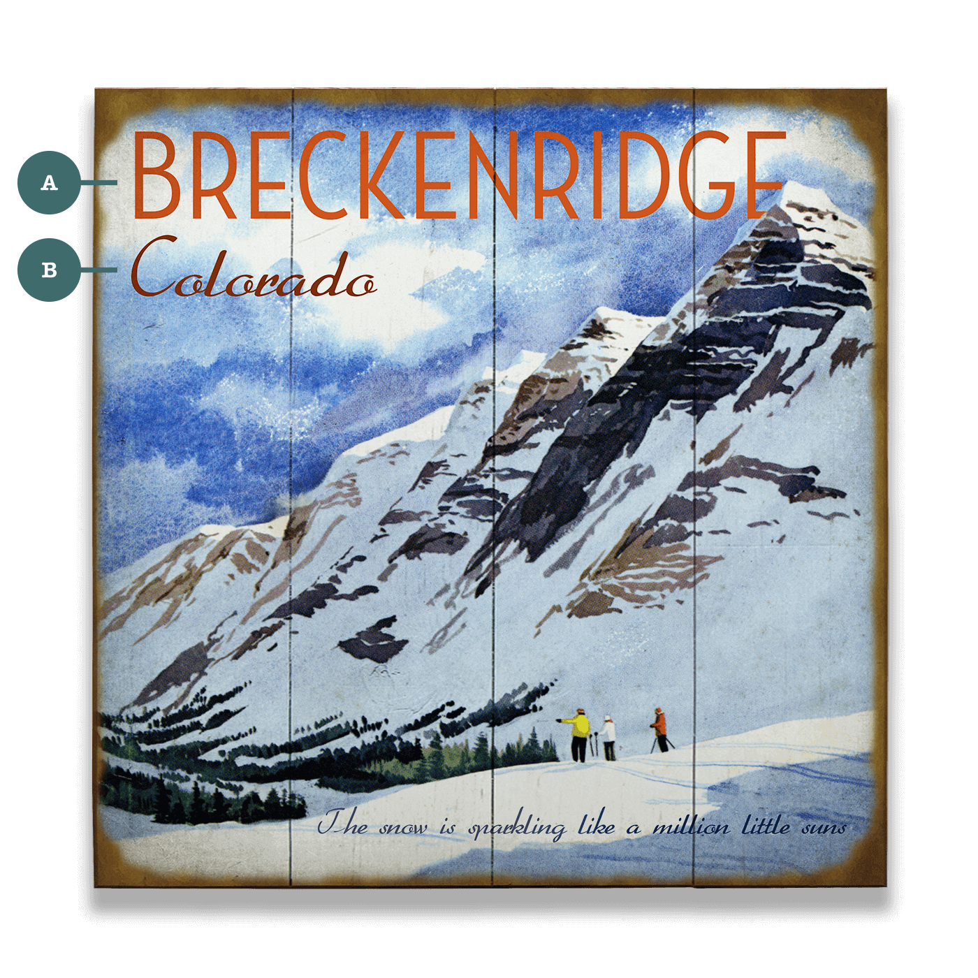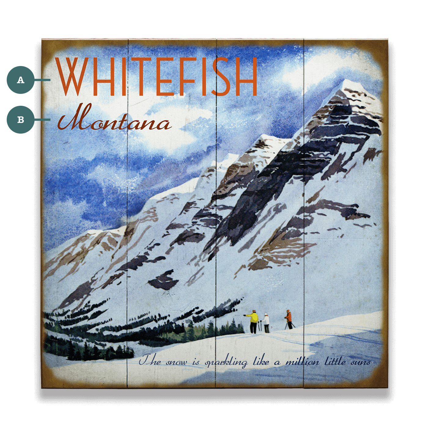 Step into a winter wonderland with this picturesque vintage print, capturing the essence of a snowy mountain retreat. The artwork features an alpine landscape, where skiers are depicted against vast snow-covered peaks under a brilliant blue sky. The quote, "The snow is sparkling like a million little suns," adds a poetic touch, enhancing the magical feel of the scene. This piece is an ideal piece to bring the serene beauty of winter into any home or office setting.