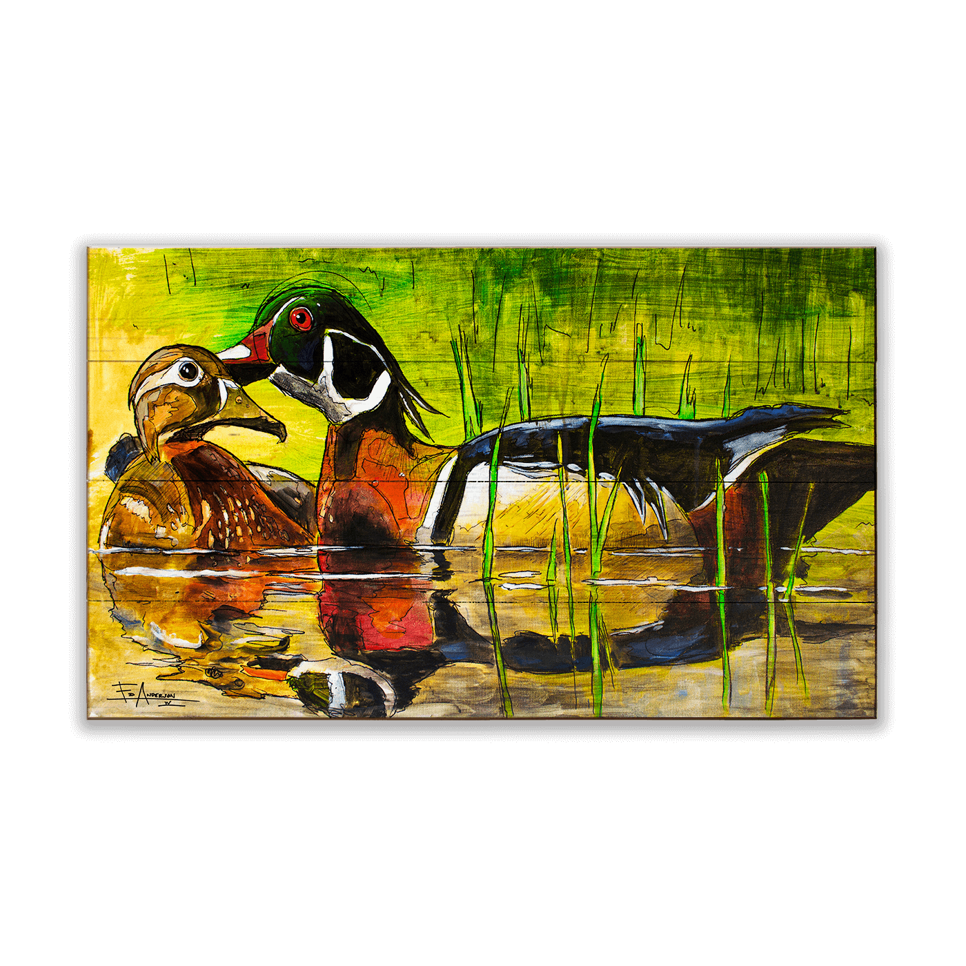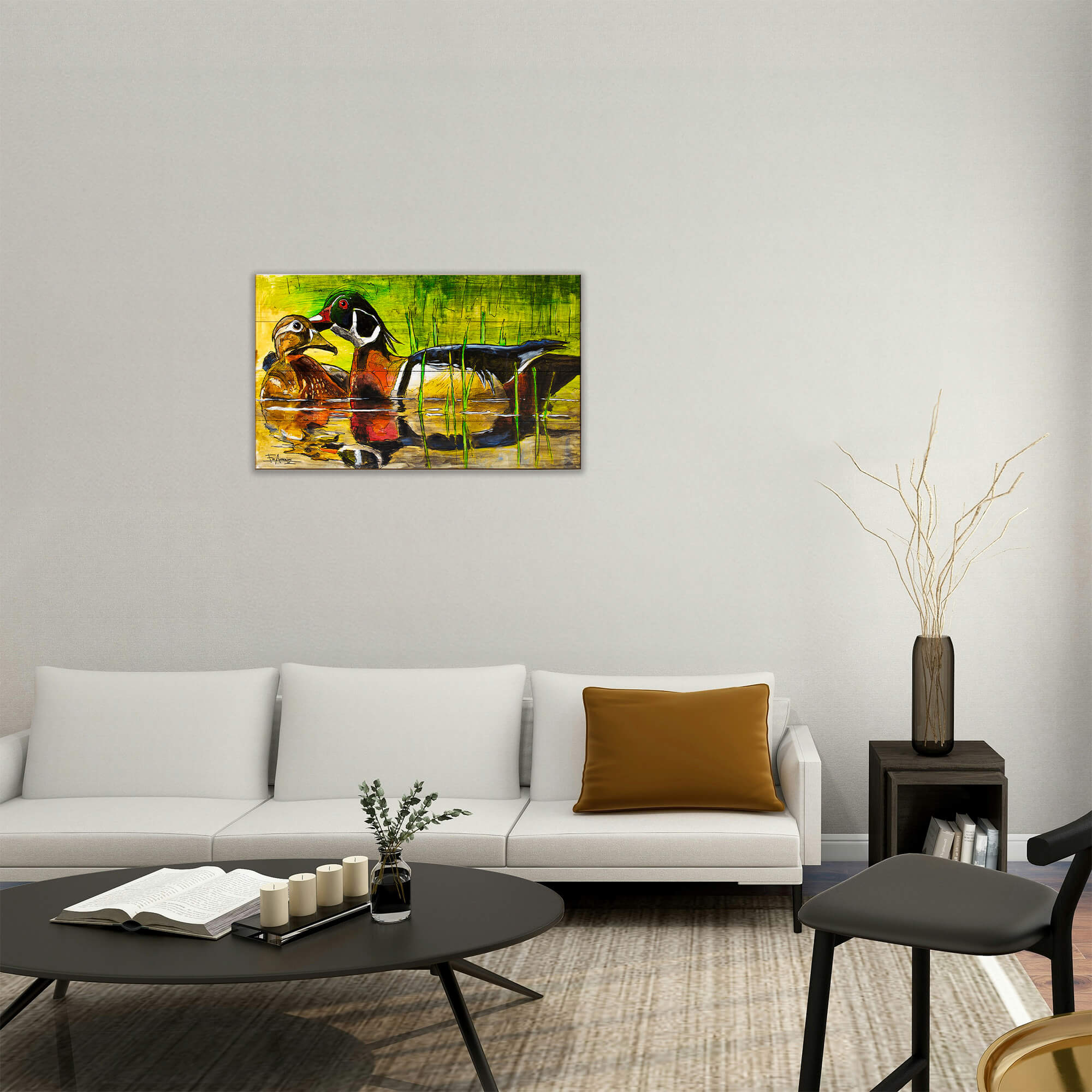This stunning artwork beautifully captures the vibrant colors and distinctive markings of wood ducks. Set against a lush, natural backdrop, the two ducks float gracefully in serene water, reflecting the tranquil ambiance of their surroundings. Their vivid plumage stands out against the greenery, showcasing the natural beauty of these iconic birds. Ideal for nature enthusiasts, bird lovers, or anyone who appreciates wildlife art, this piece is a celebration of the wood duck's elegance in its natural habitat.