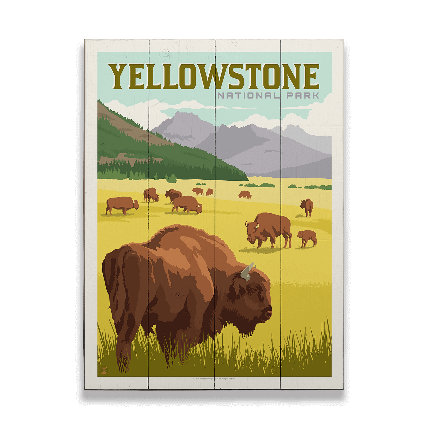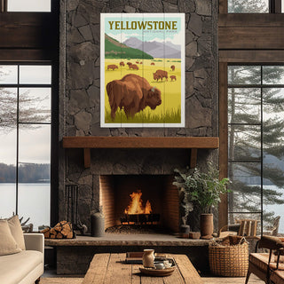The harmonious palette and serene scenery reflect Yellowstone's natural heritage, a place where wildlife and rugged nature thrive under the watchful peaks of the Rocky Mountains. This piece is a celebration of Yellowstone's rich biodiversity and a reminder of the park's role as a sanctuary for one of North America's most cherished native species.