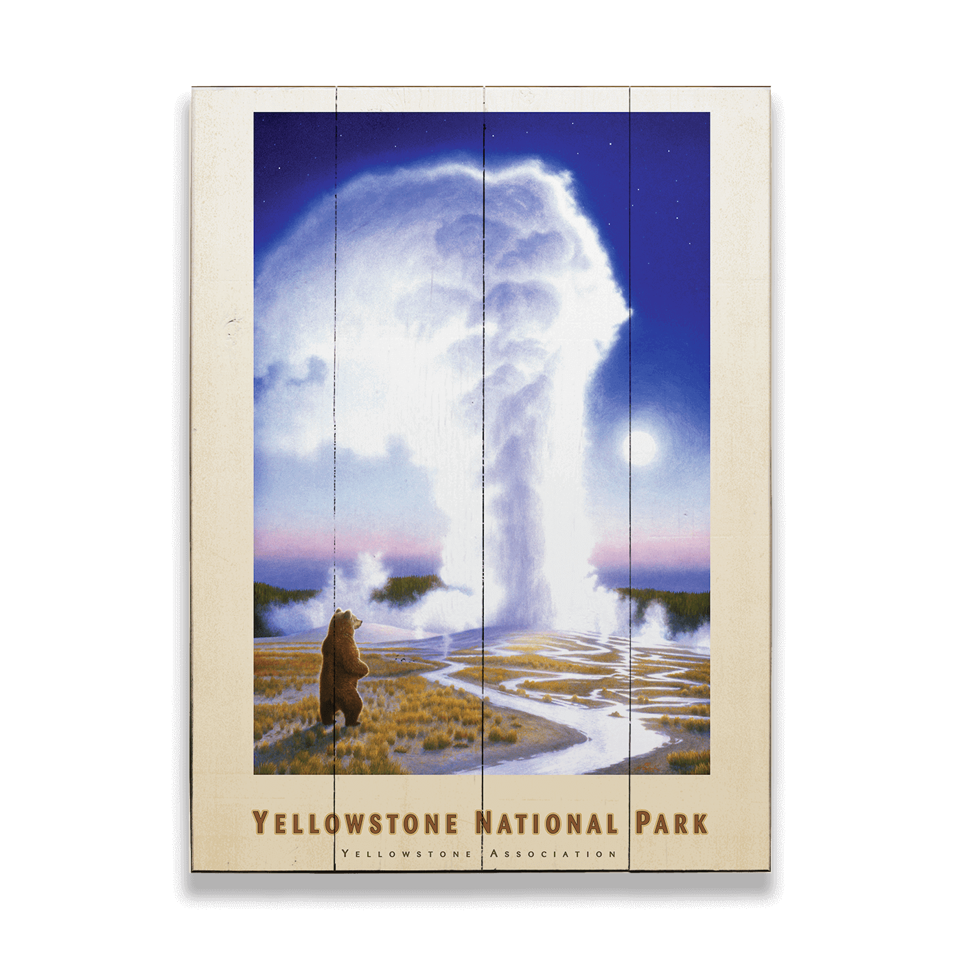 This evocative piece beautifully melds the wild essence of nature with the surreal. Available as a print on either wood or metal, this artwork captures a majestic grizzly bear standing upright, gazing at the spectacular eruption of Old Faithful. The bear's stance on patchy grass, with streams of water meandering past, creates a compelling foreground against the backdrop of a dense forest. The intriguing lighting of the scene, where daytime seems to blend into night with stars twinkling in the darkened sky, perhaps at sunset, adds a layer of mystique. This piece is perfect for nature lovers, wildlife enthusiasts, and admirers of national park art, bringing a piece of Yellowstone's wonder into your home.