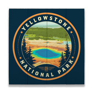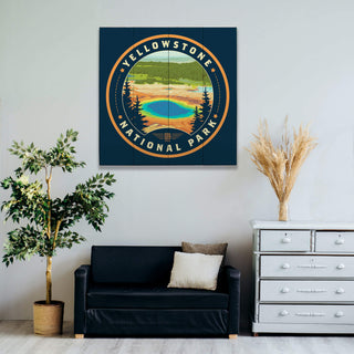 This vibrant artwork celebrates Yellowstone National Park and its stunning natural features, like the Grand Prismatic Spring depicted at the center. The radiant colors of the spring are a focal point, encircled by the lush greenery and vast landscapes of the park. Encapsulated within a compass design, this piece symbolizes the spirit of exploration and the natural wonders that await in Yellowstone.