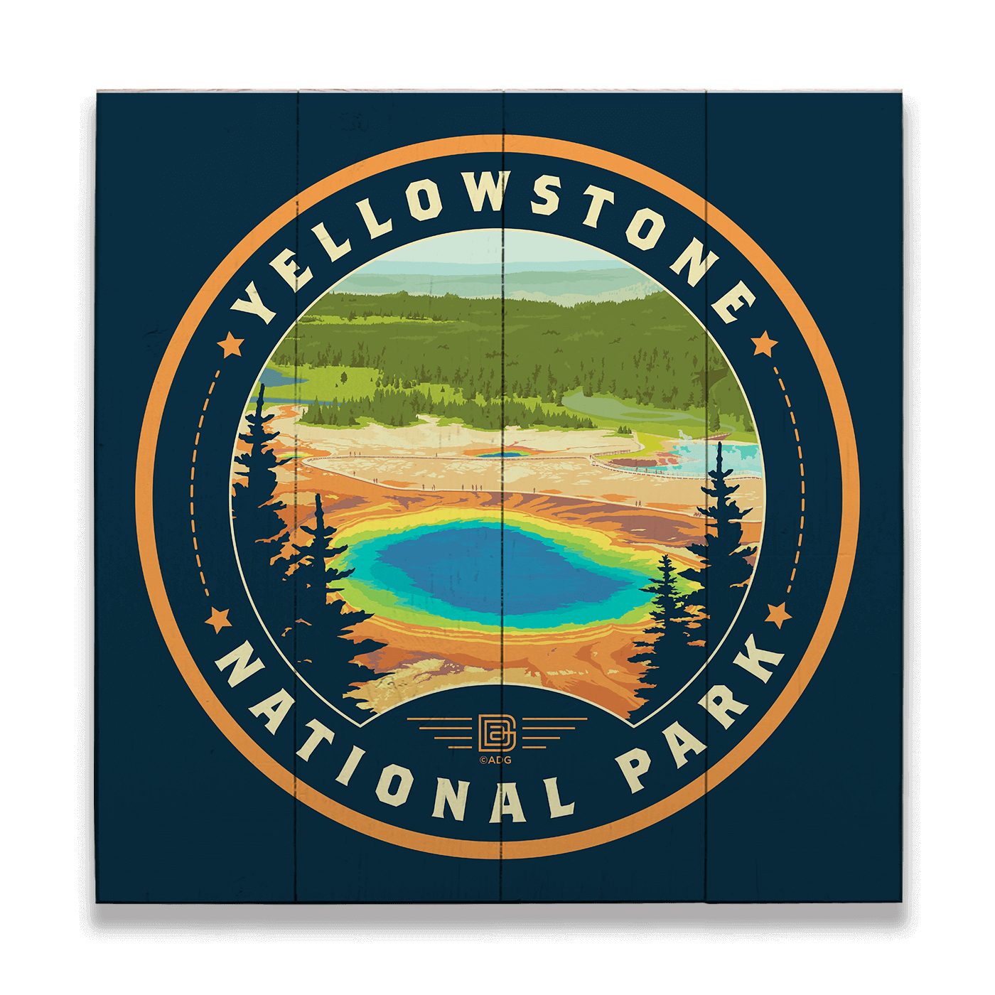 The circular frame suggests a badge of honor, reminiscent of the park's legacy as a pioneering piece of America’s national heritage. This artistic rendering is a call to the wild-hearted, beckoning them to discover the full spectrum of beauty at Yellowstone National Park, from its geothermal marvels to its expansive vistas.